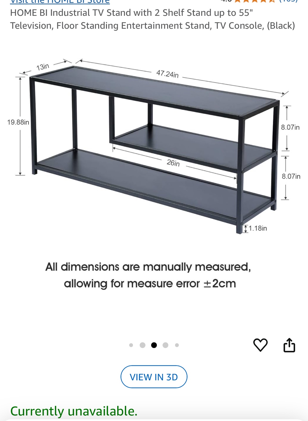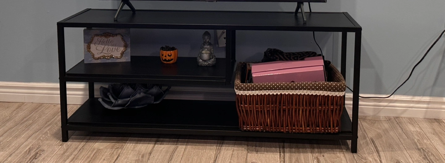 Black metal TV stand. Two shelves. Holds TVs up to 55 inches. Great for smaller spaces. Industrial design. It is just few months old and is in great condition .
