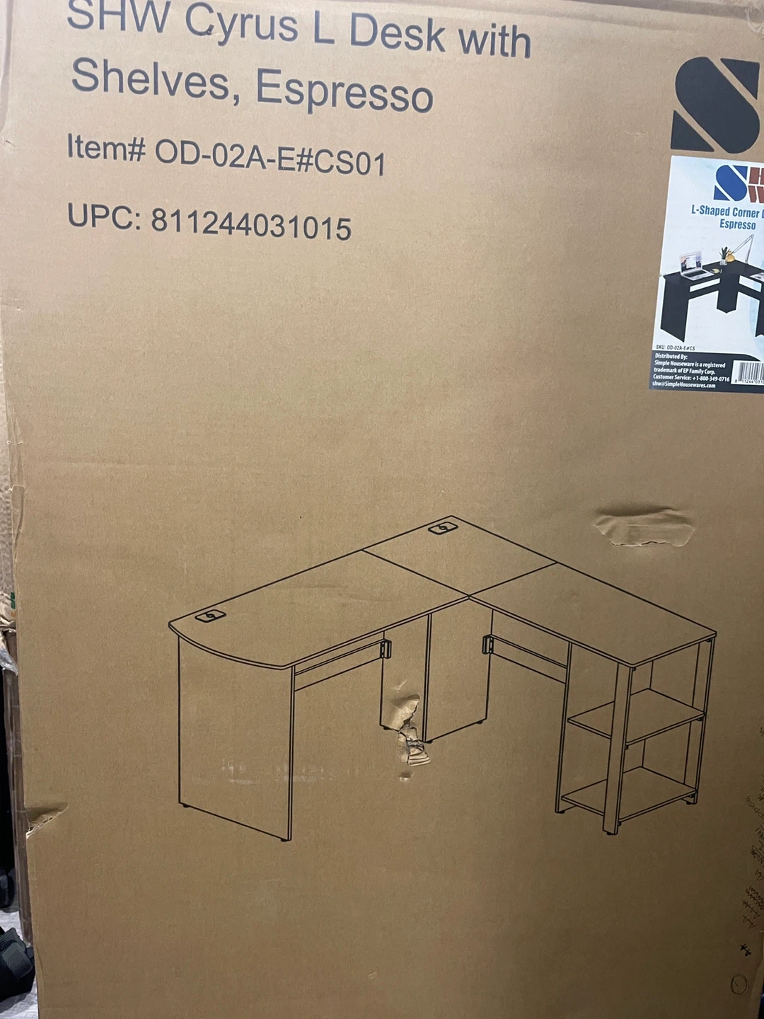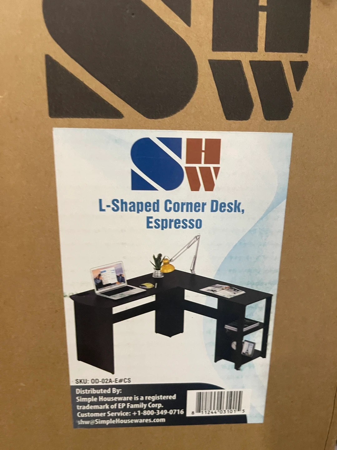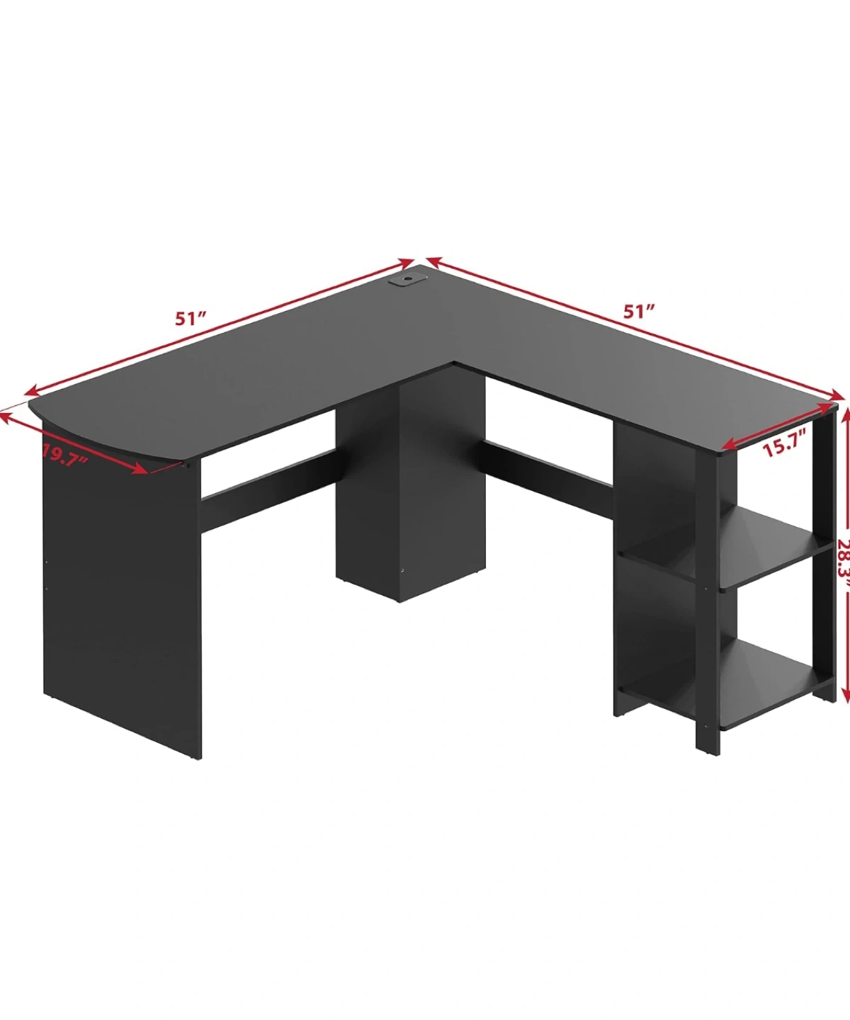 This SHW Cyrus L-shaped corner desk comes in an espresso finish. It has integrated shelves for storage. The desk dimensions are approximately 51" x 51" on each side, with a depth of 19.7" and a height of 28.3".