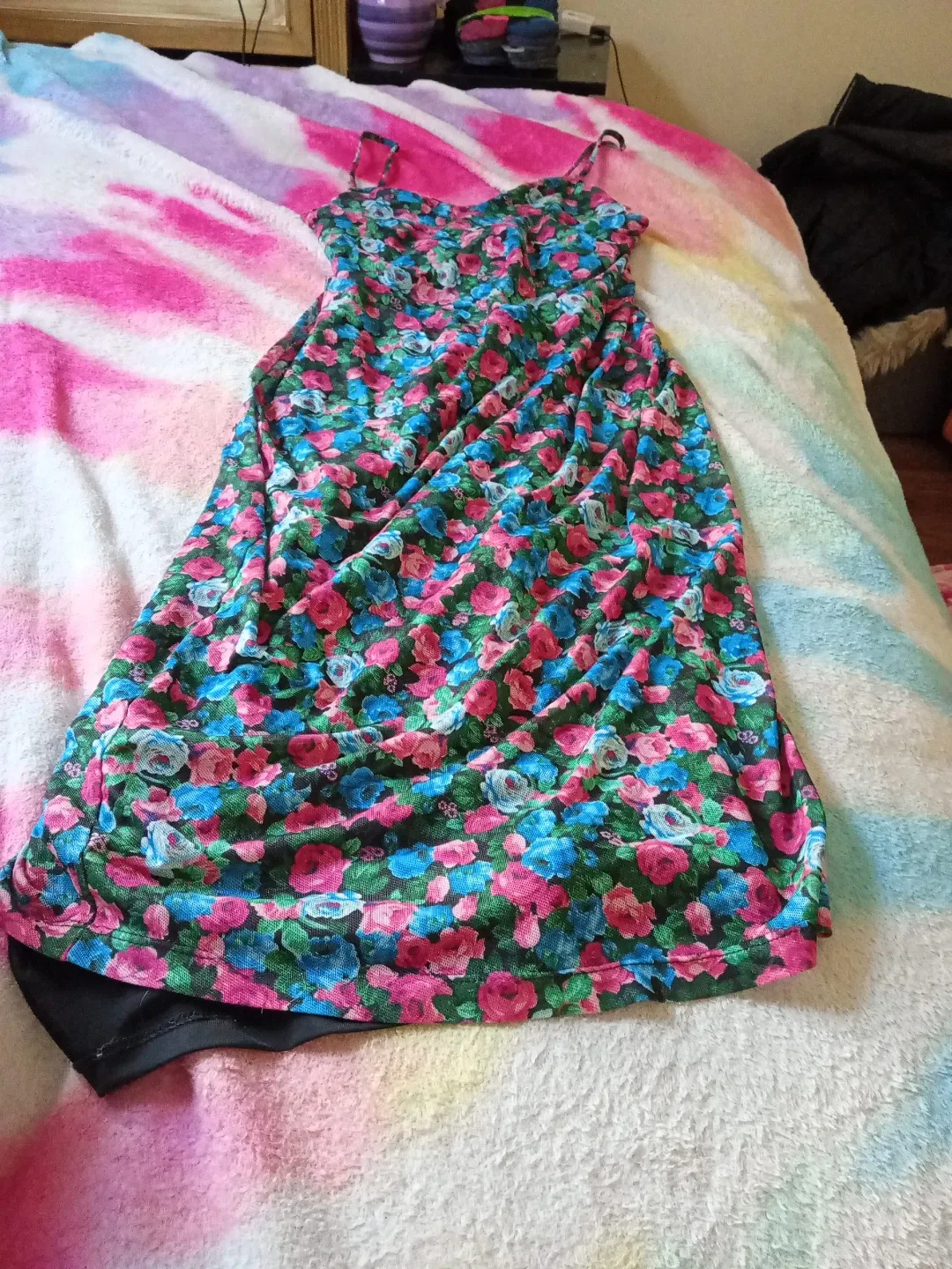 This is a floral print dress with spaghetti straps. It's made of a lightweight fabric and has a black underlayer. The dress features a colourful floral pattern.