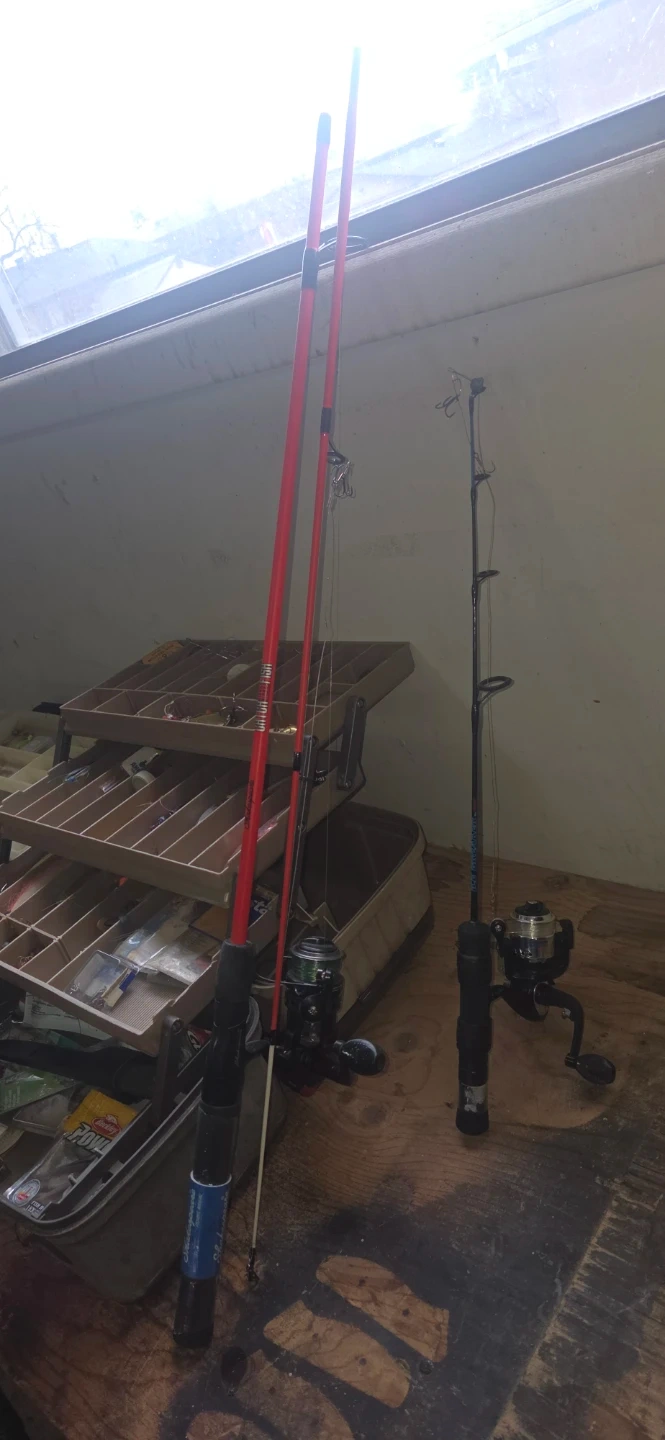 A red fishing rod and a black fishing rod, both with reels. One rod has 'CATCH FISH' printed on it. TACKLE BOX NOT INCLUDED 15 dollars EACH