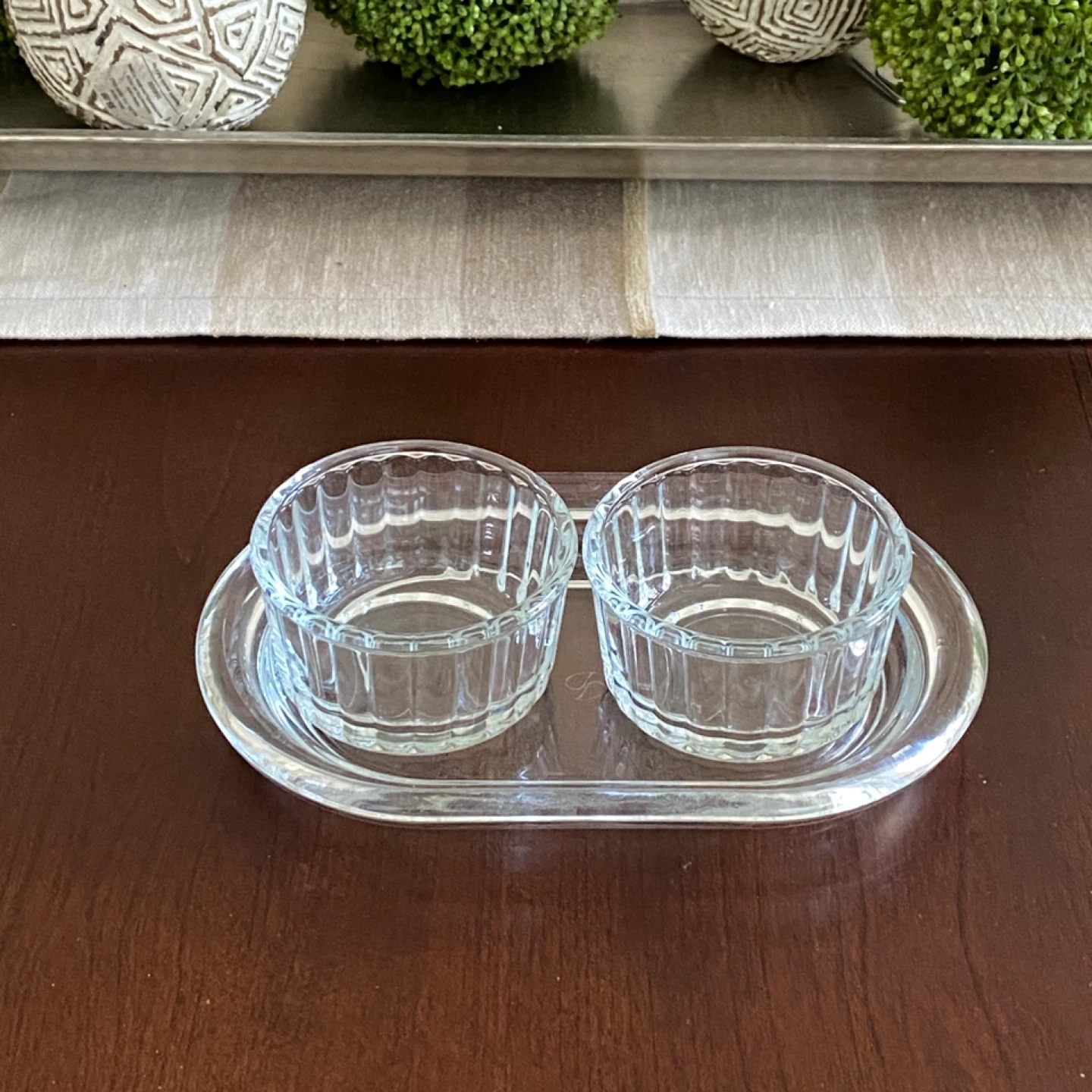 A set of two clear glass ramekins with a ribbed texture, on a matching oval glass tray.