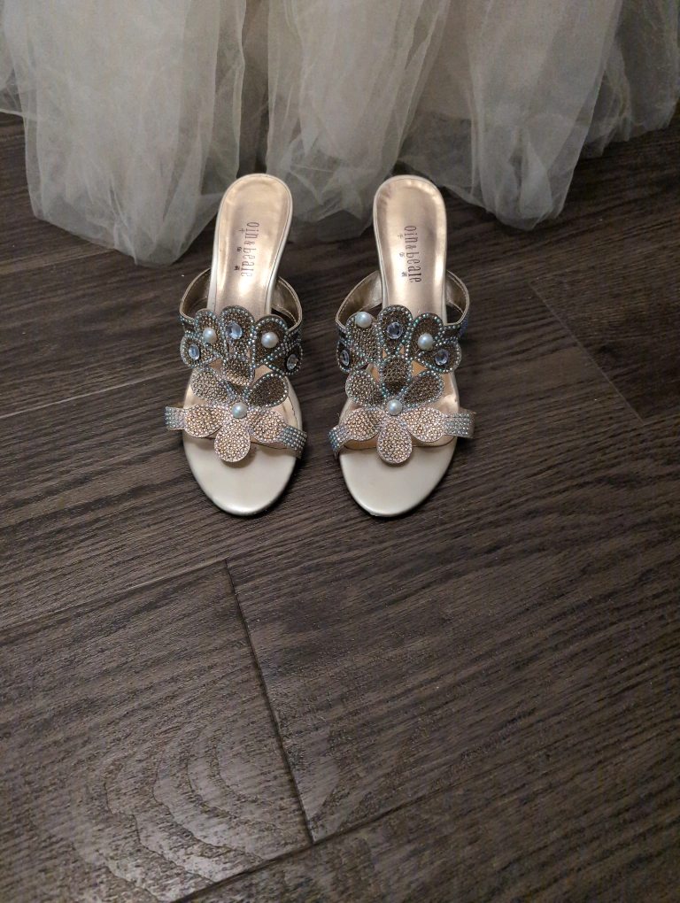 The skirt is floor length and made of satin and tulle all in a soft pastel colour. The shoes are by Nima and match the elegance of the dress which is an original couture designer dress.