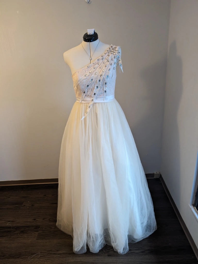 This featured dress has one shoulder and a triple spegetti strap back with eyelets and satin ribbon so it can go from a size 6 to a 10.