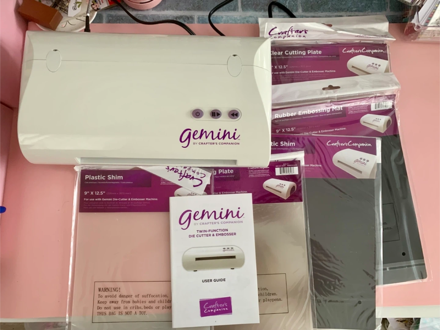 This Gemini by Crafter's Companion is a twin-function die-cutter and embosser. It comes with various plates and shims for crafting projects. It's a great tool for card making and scrapbooking!