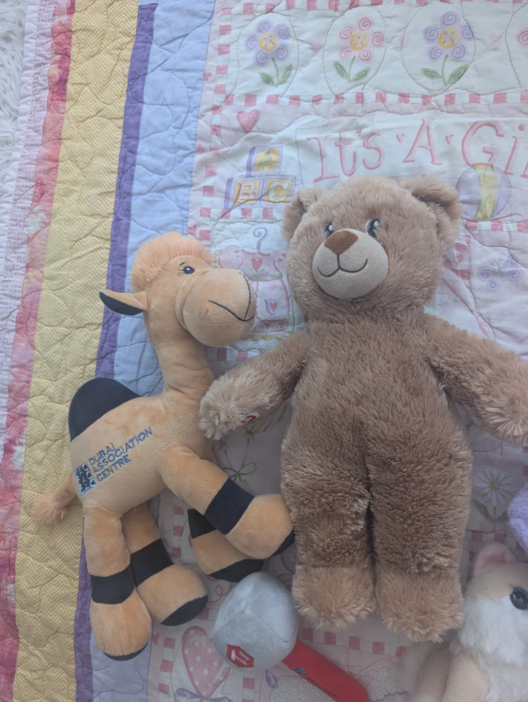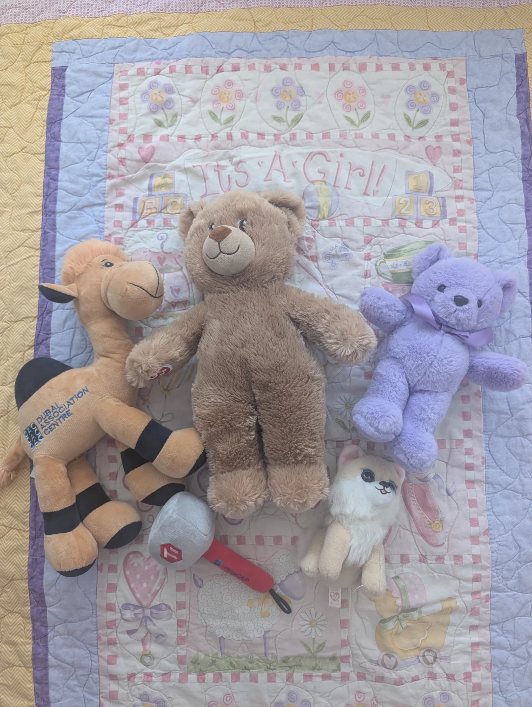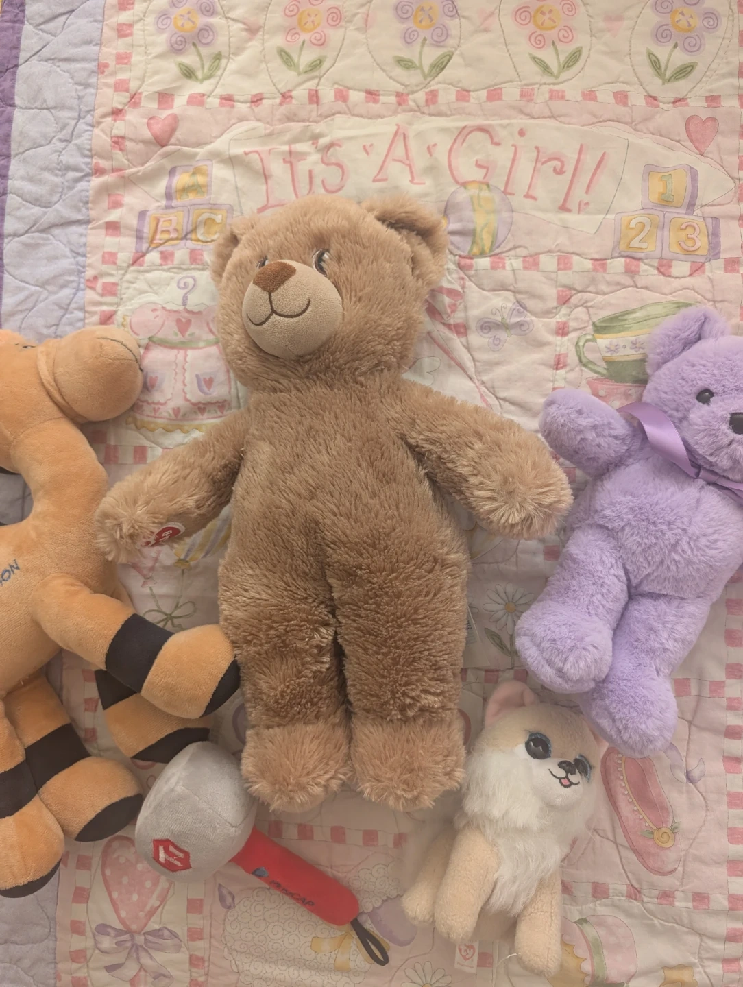 This bundle includes a brown teddy bear, a purple teddy bear with a ribbon, a camel plush, and a small white and pink dog plush. There's also a small grey and red plush mic.