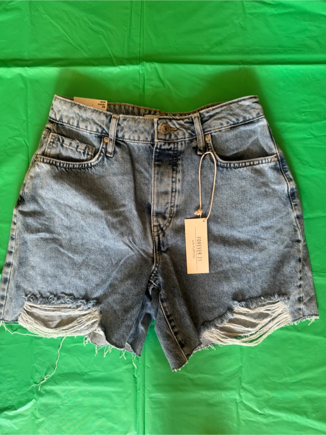 Estos son pantalones cortos Forever 21 Mom en un denim lavado ligero desgastado. Son talla 26. Incluye etiquetas originales. Llévalo en $7