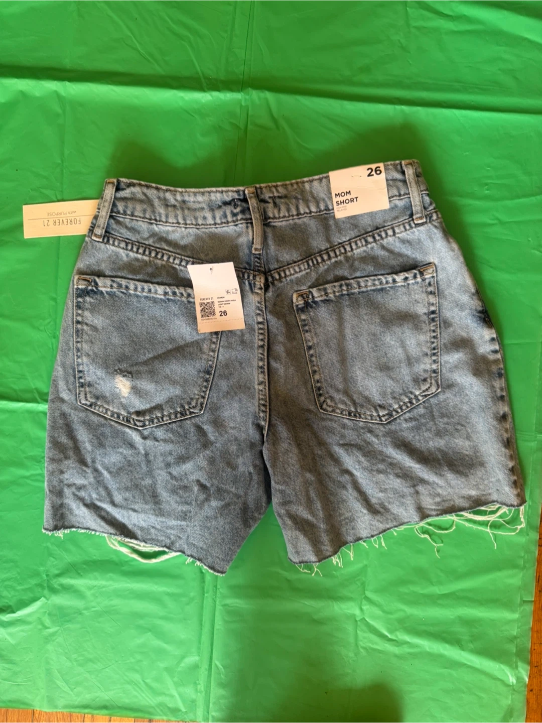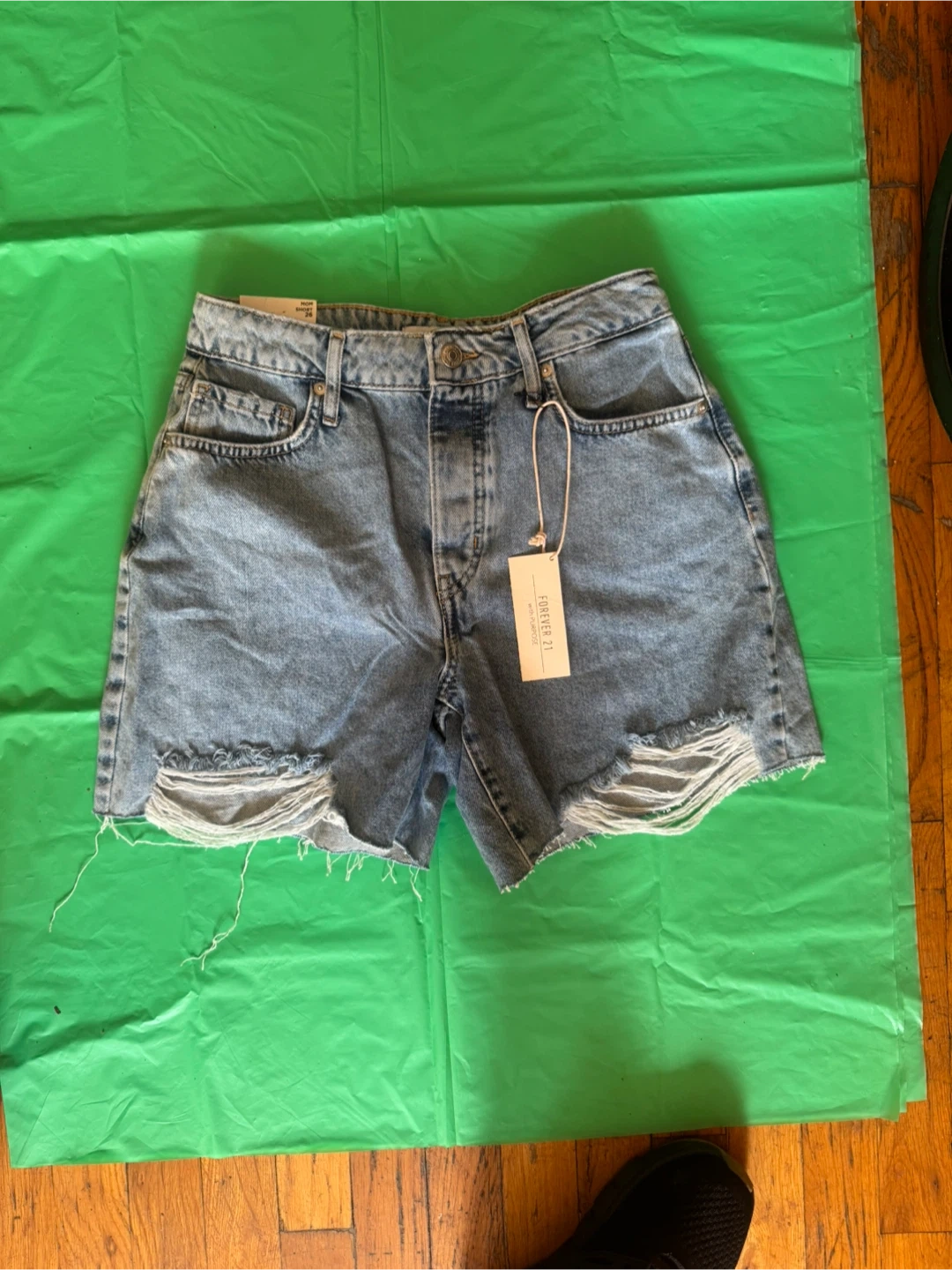Estos son pantalones cortos Forever 21 Mom en un denim lavado ligero desgastado. Son talla 26. Incluye etiquetas originales. Llévalo en $7