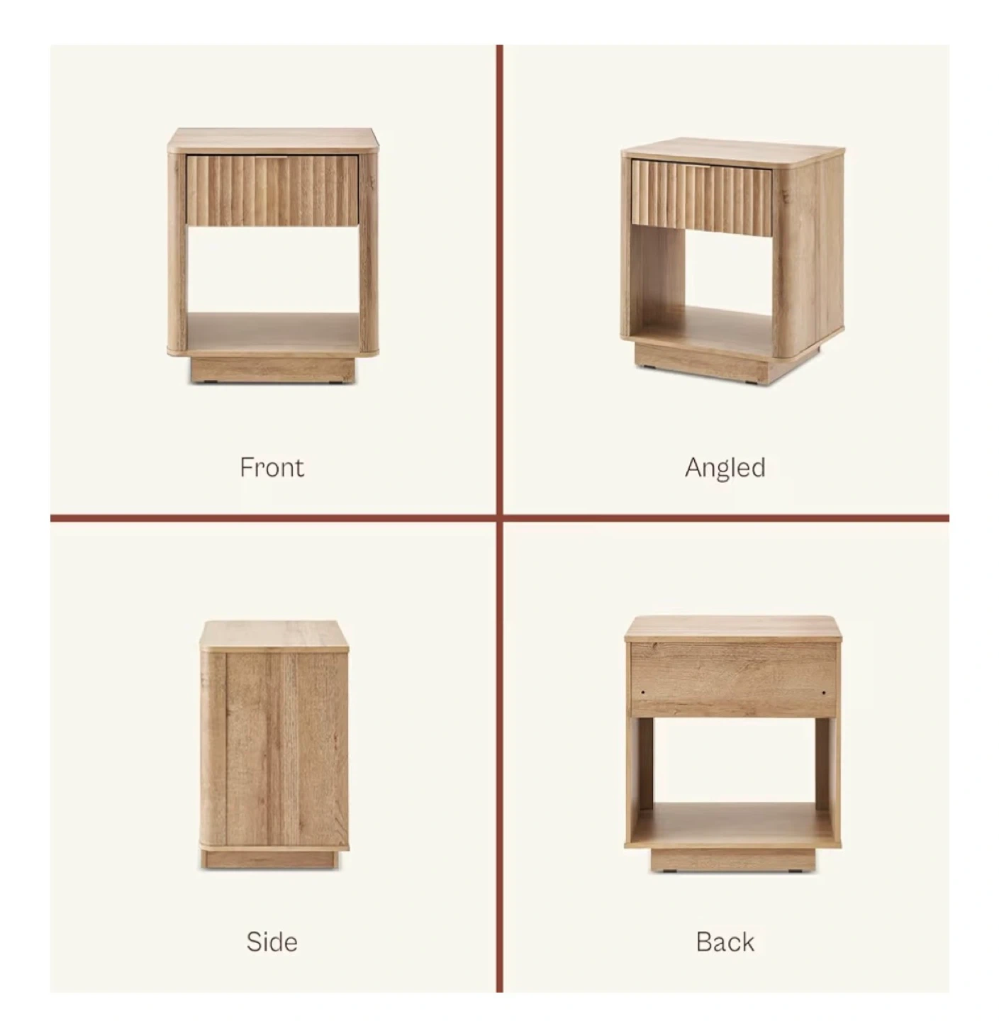 This wood nightstand features a natural wood grain finish and a smooth-gliding drawer. It has both open and hidden storage for essentials.