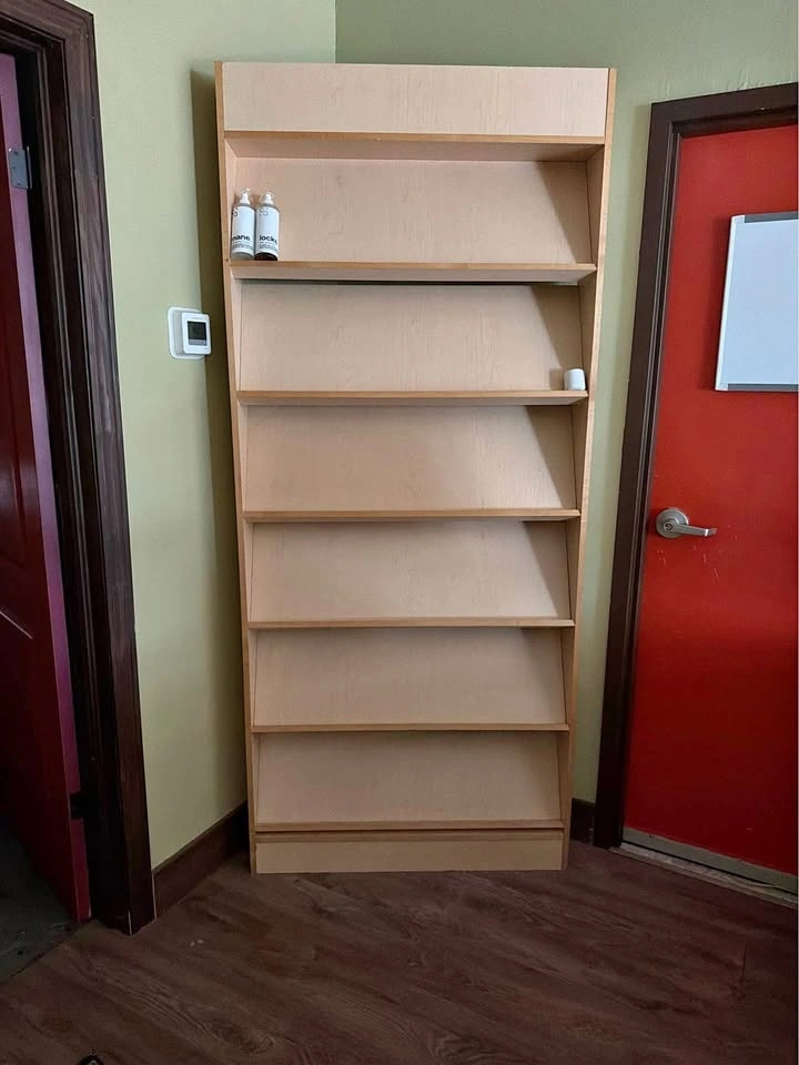 This is a tall, light wood bookshelf. It has six shelves perfect for storing books or display items. It's a great addition to any room for organization.