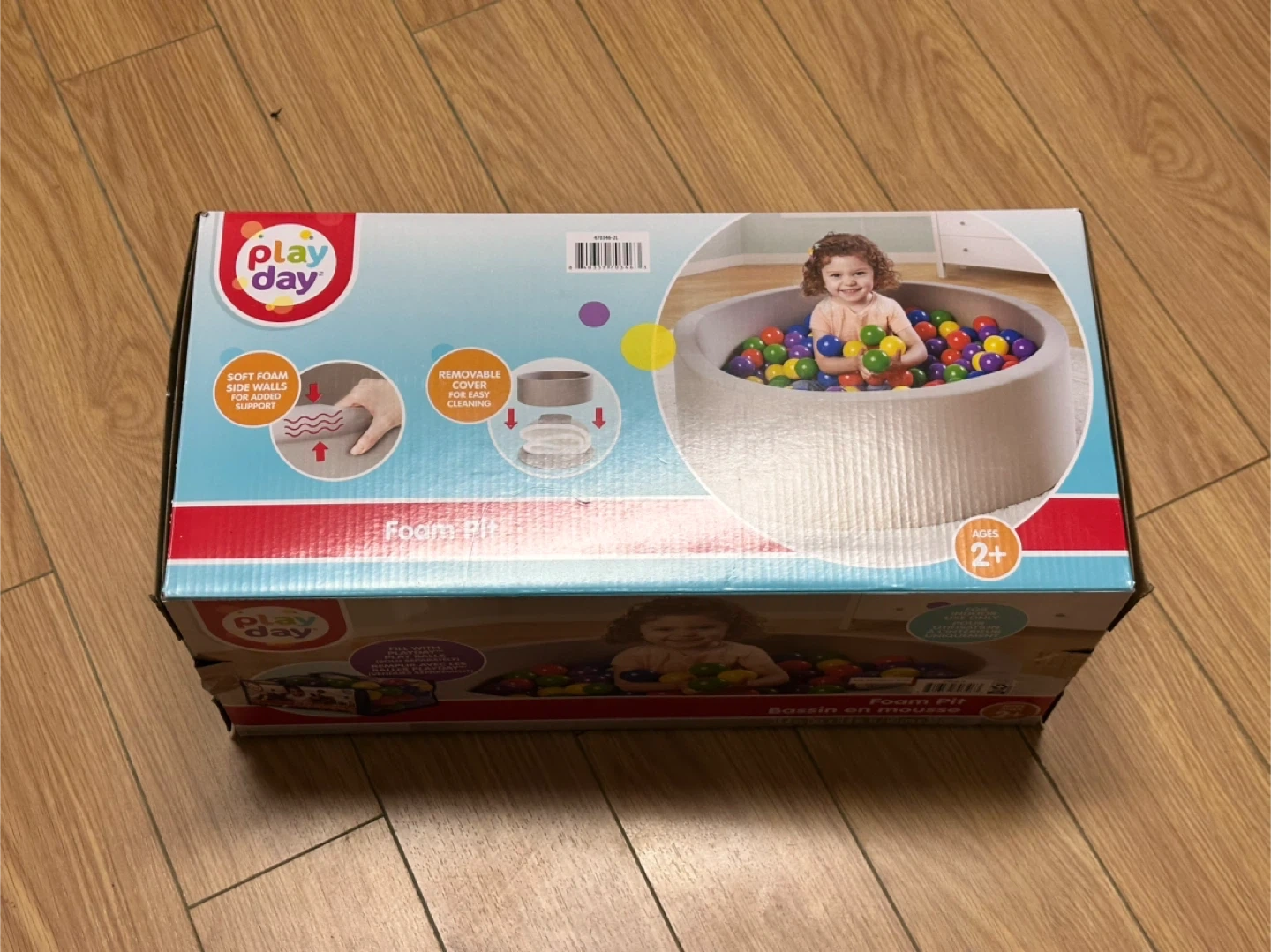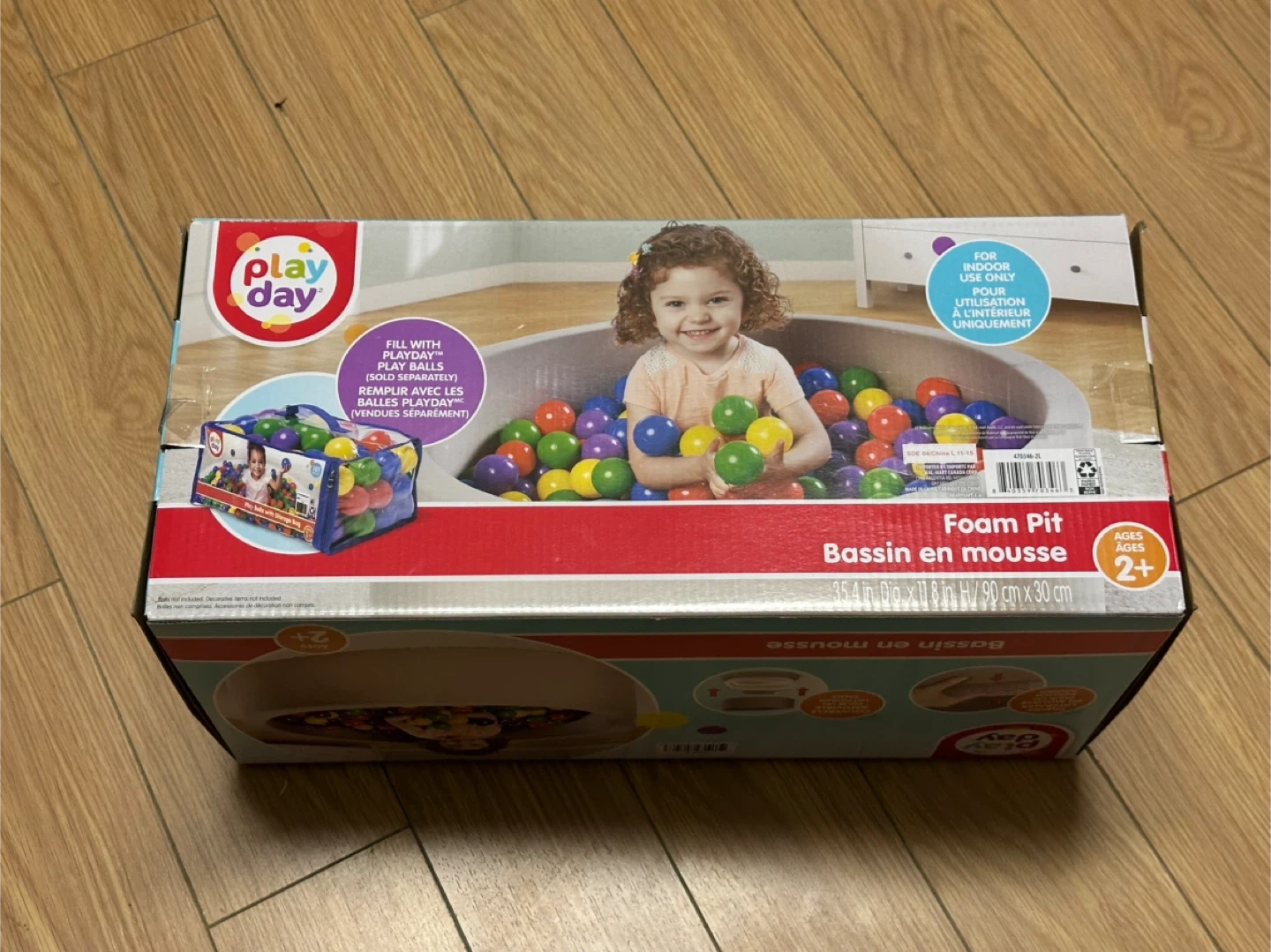 This Play Day foam pit is for indoor use only. It has soft foam side walls for support and a removable cover for easy cleaning. Recommended for ages 2 and up.