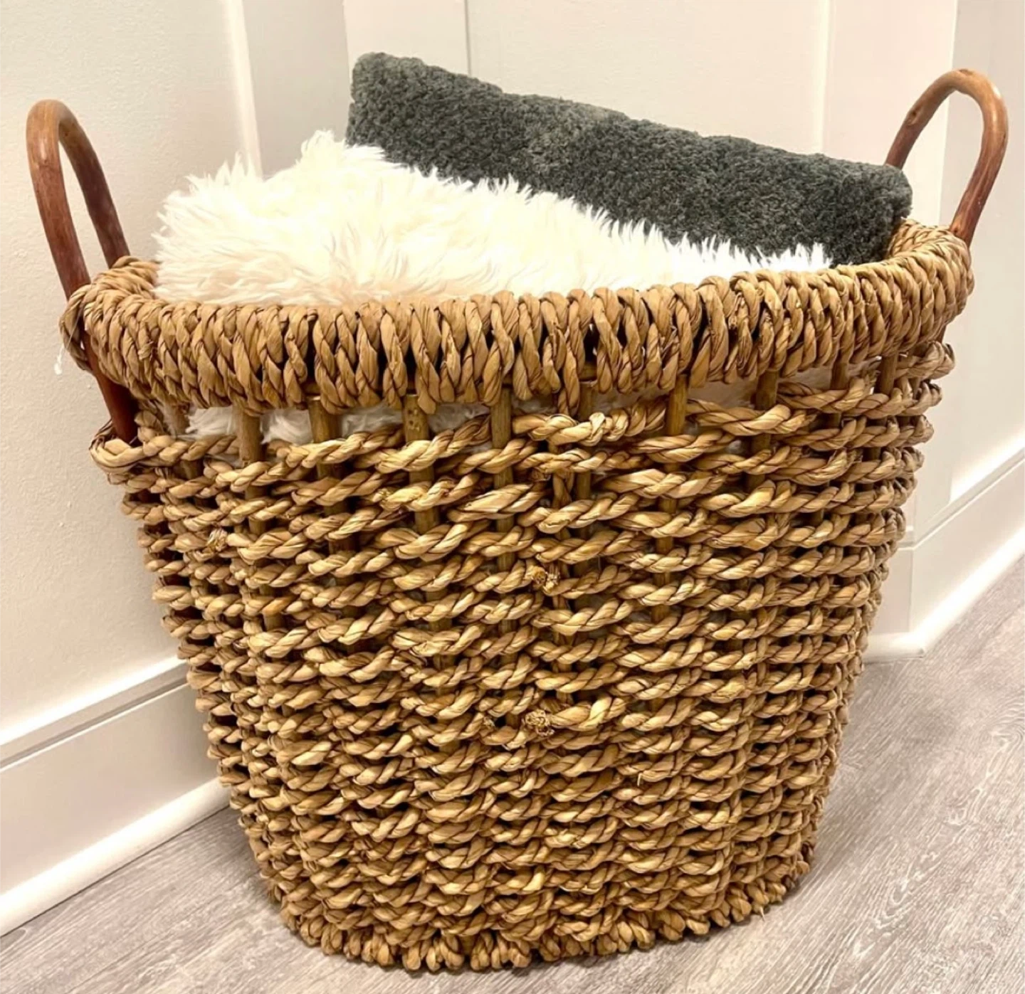 Beautiful basket with sturdy handles. It's a great size for storing blankets, toys, or laundry. This basket adds a natural, cozy touch to any room!