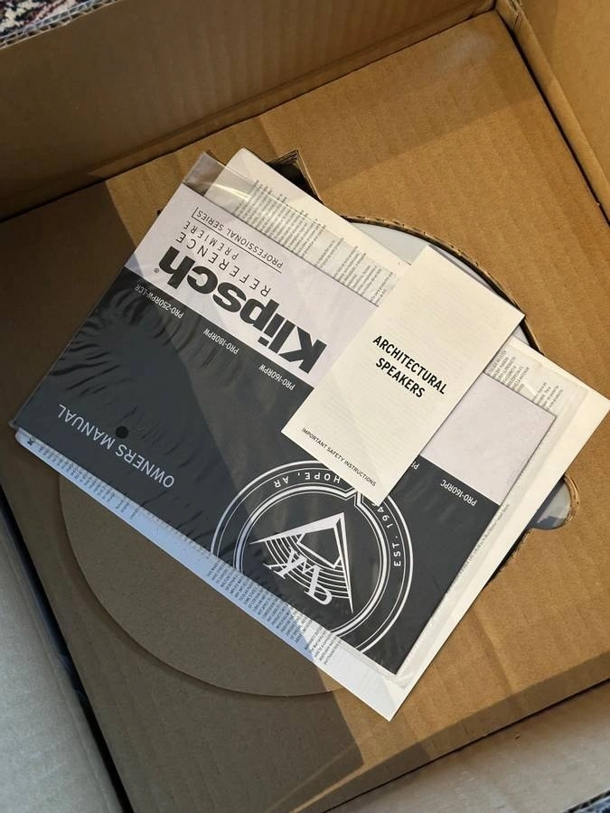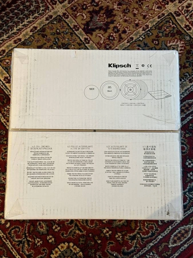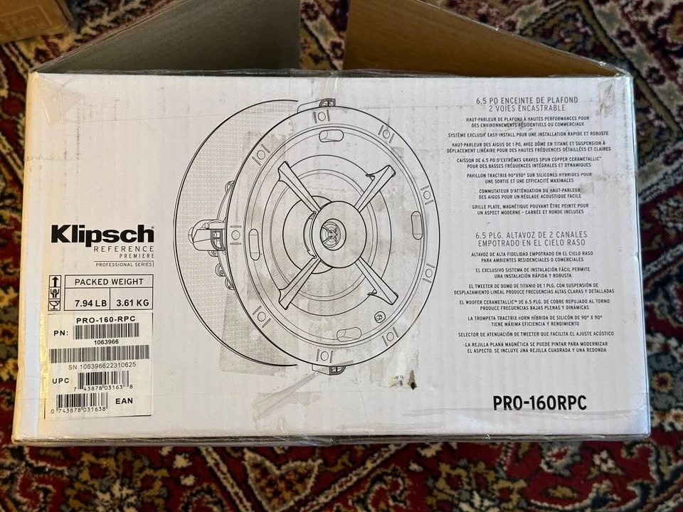 New, only opened box to take pictures. These Klipsch PRO-160RPC in-ceiling speakers bring dynamic, powerful, detailed Reference Premiere sound to your distributed audio or home theater system. Features a 6.5" Cerametallic woofer and a 1" Titanium Dome Tweeter mated to a composite coated round Tractrix® horn. Includes an exclusive, modular SecureFit™ Installation System. Comes with both round and square paintable, magnetic grilles. Built from 2017. Frequency Range: 56Hz - 23kHz +/- 3dB. High Frequency Driver: 1" Titanium Dome Tweeter. Low Frequency Driver: 6.5" Cerametallic Woofer. Sensitivity: 95 dB. Power Handling: 50W RMS / 200W Peak. Impedance: 8 Ohm Compatible. Dimensions: Diameter: 9.2", Cutout: 8.3", Mounting Depth: 4.34".