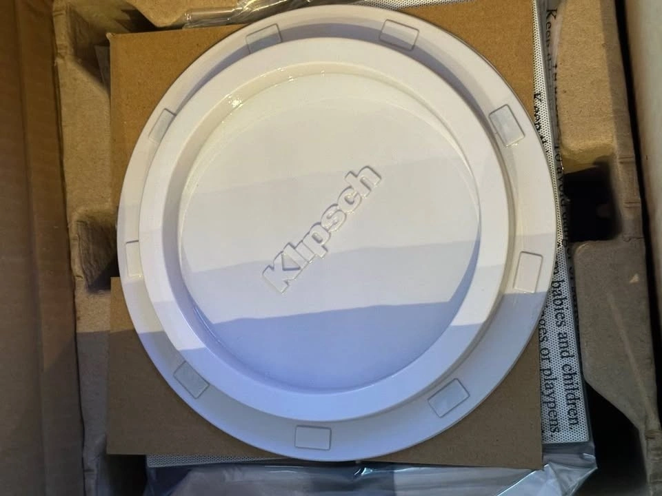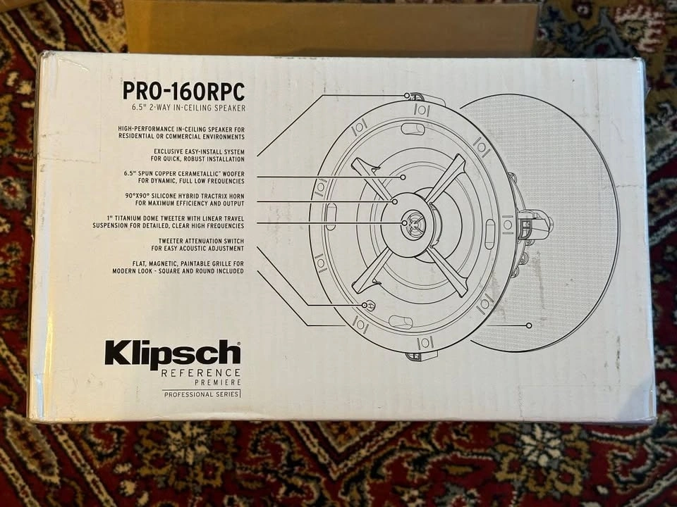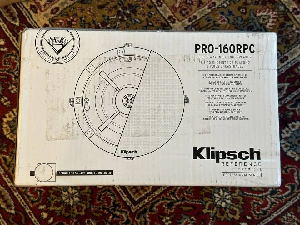 New, only opened box to take pictures. These Klipsch PRO-160RPC in-ceiling speakers bring dynamic, powerful, detailed Reference Premiere sound to your distributed audio or home theater system. Features a 6.5" Cerametallic woofer and a 1" Titanium Dome Tweeter mated to a composite coated round Tractrix® horn. Includes an exclusive, modular SecureFit™ Installation System. Comes with both round and square paintable, magnetic grilles. Built from 2017. Frequency Range: 56Hz - 23kHz +/- 3dB. High Frequency Driver: 1" Titanium Dome Tweeter. Low Frequency Driver: 6.5" Cerametallic Woofer. Sensitivity: 95 dB. Power Handling: 50W RMS / 200W Peak. Impedance: 8 Ohm Compatible. Dimensions: Diameter: 9.2", Cutout: 8.3", Mounting Depth: 4.34".