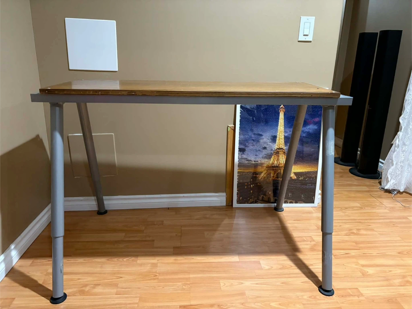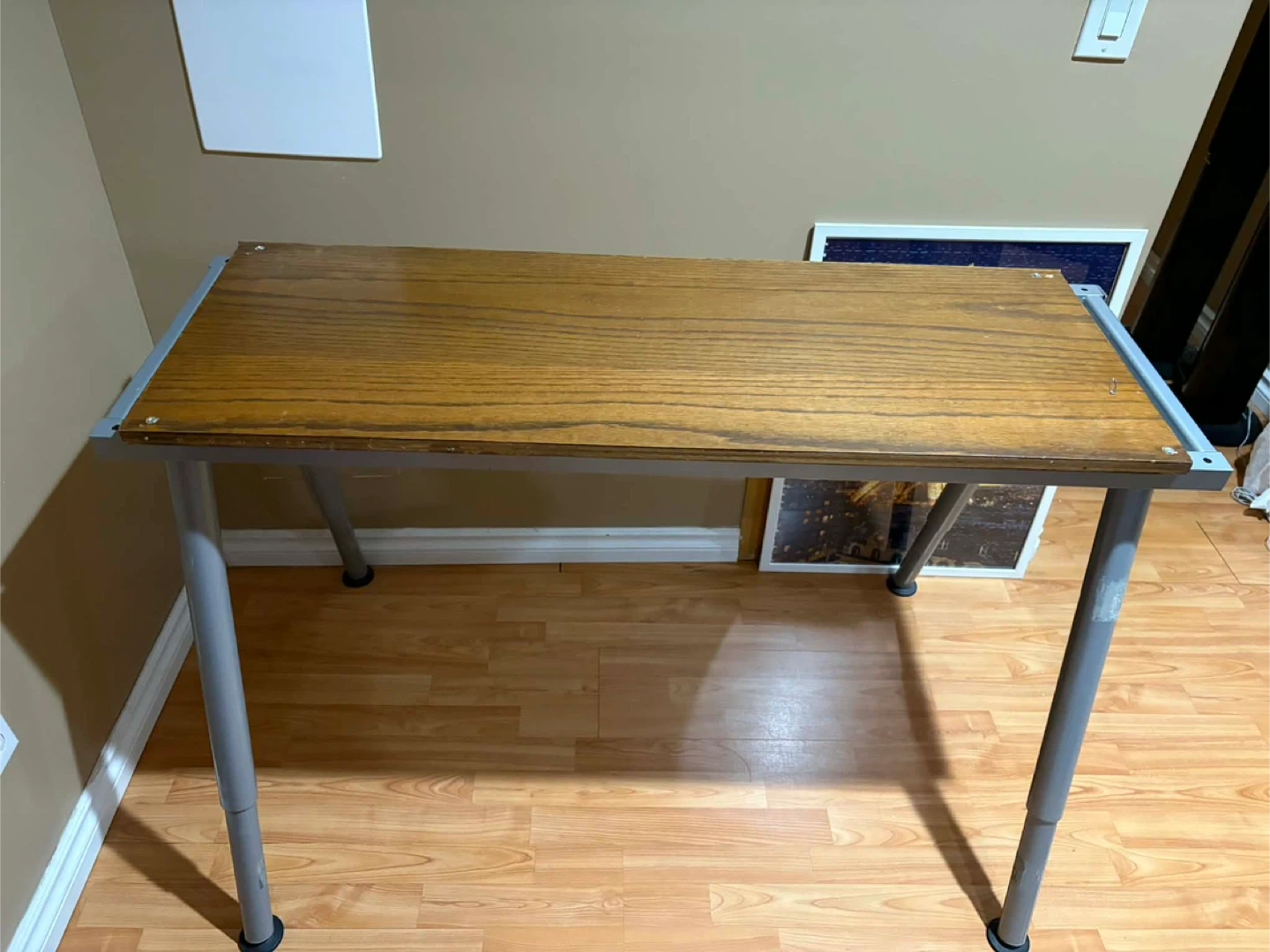 This desk has a wood-look laminate top and metal legs. It's a great size for a home office or study space. The legs are adjustable.