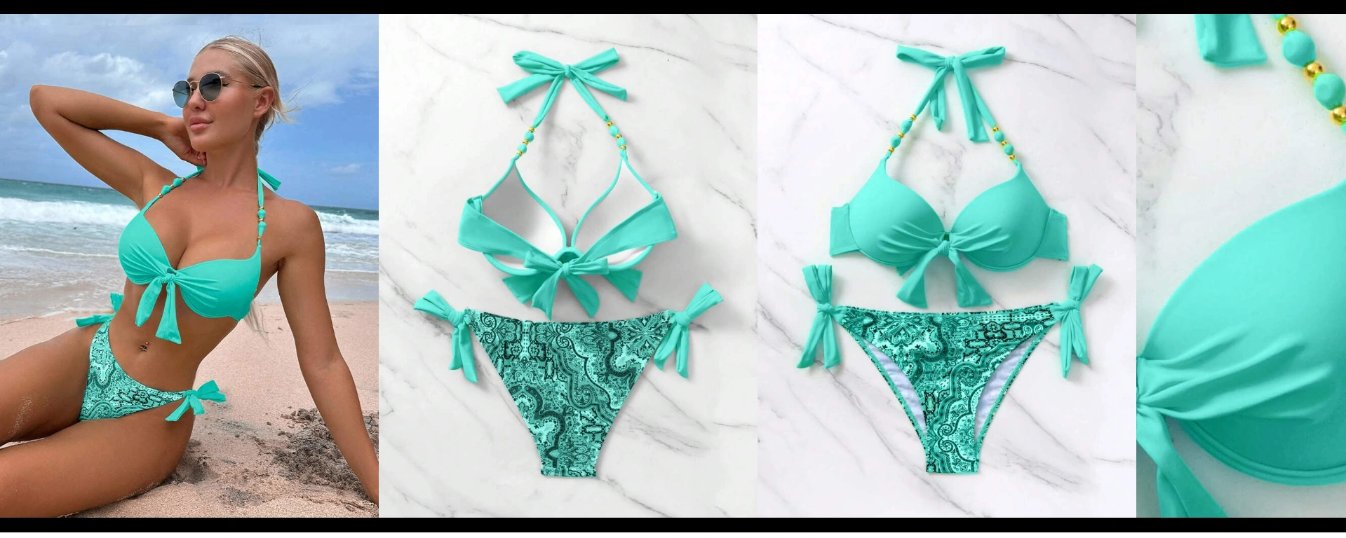 Beautiful Swim Vcay 2-piece bikini set featuring a push-up top with a knot-front detail and adjustable halter ties. Paired with paisley-print bikini bottoms with side ties for a flattering, customizable fit. Bright, beachy color perfect for summer vacations and pool days.