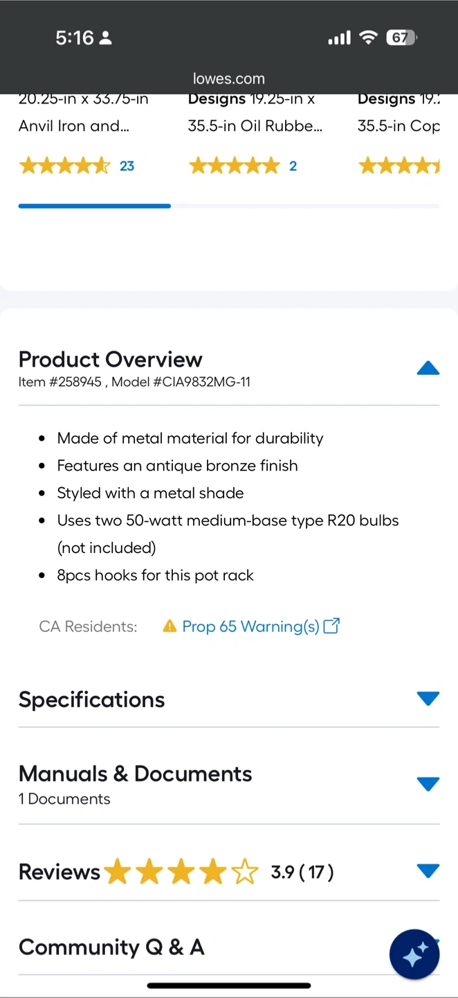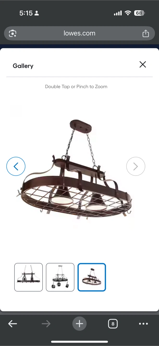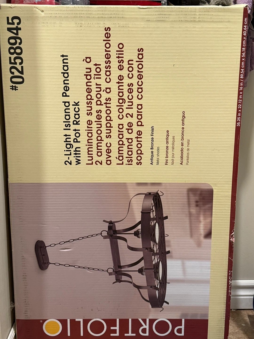 This Portfolio 2-light island pendant comes in an antique bronze finish and is made of metal. It has a styled metal shade and includes 8 pot rack hooks. It uses two 50-watt medium-base type R20 bulbs (not included).
