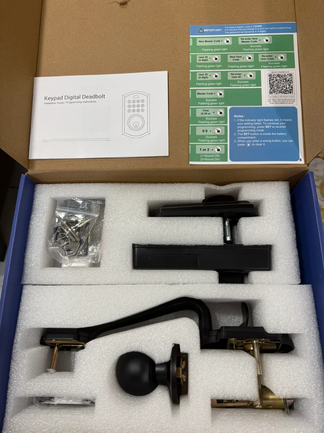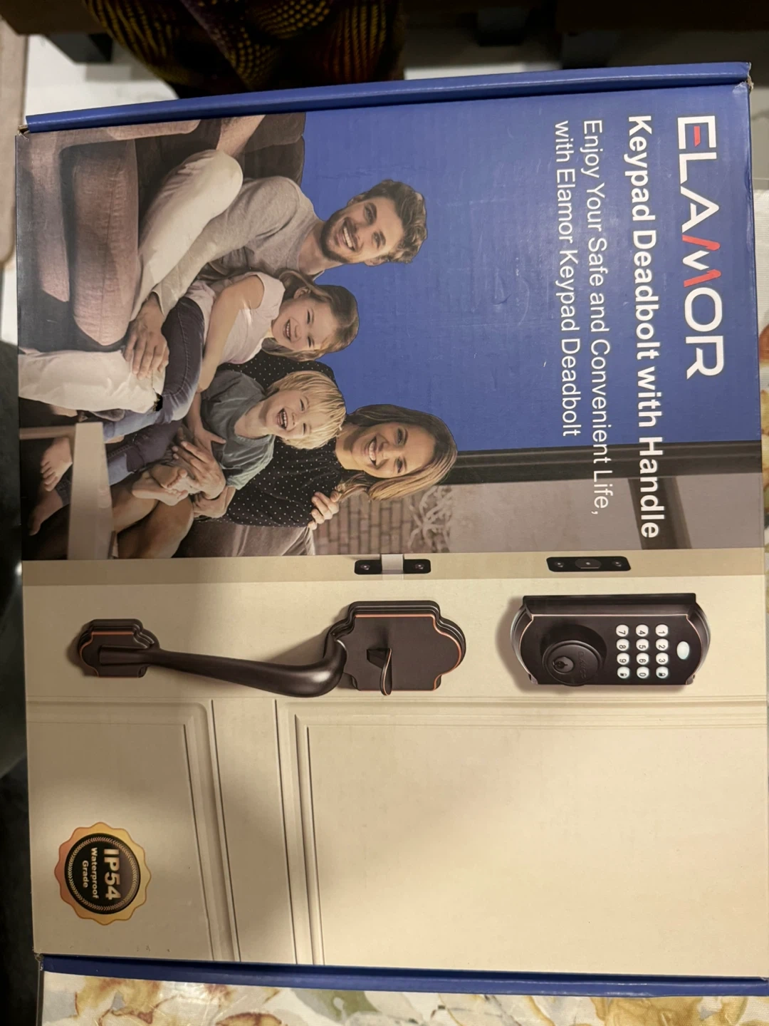 This Elamor keypad deadbolt with handle offers smart and safety lock features. It includes a keypad unlock, back-up keys, easy installation, high security, auto-lock, and multi-user access. The keypad is illuminated for easy visibility in the dark.