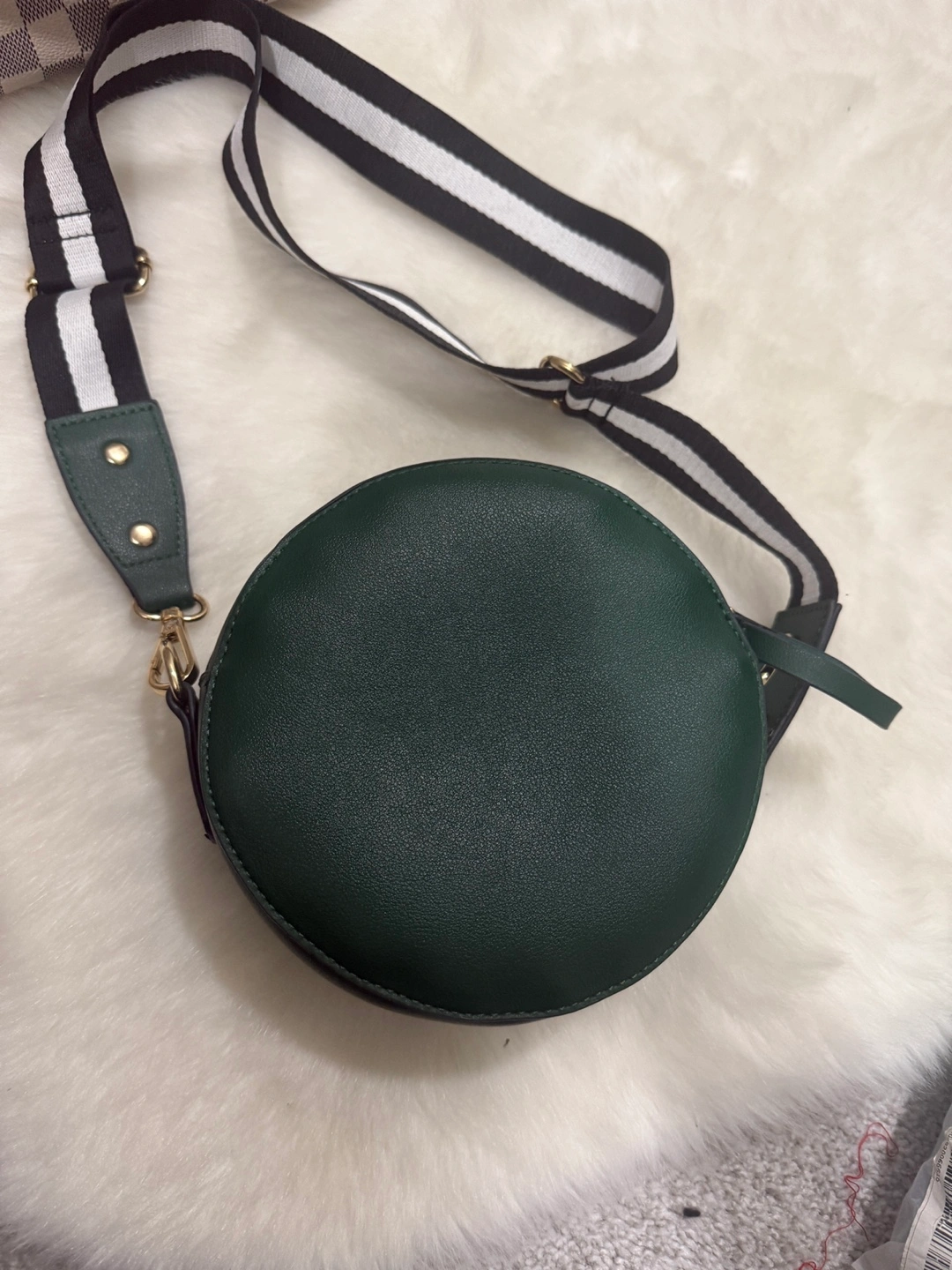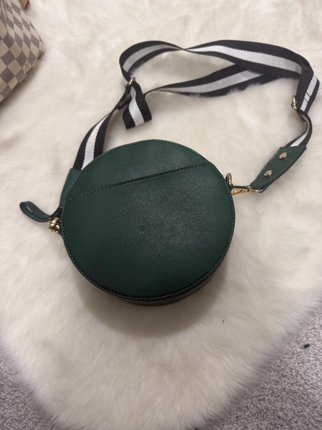 Cute dark green crossbody bag. Round shape. Features a black and white striped adjustable strap. Gold-toned hardware. Zipper closure.