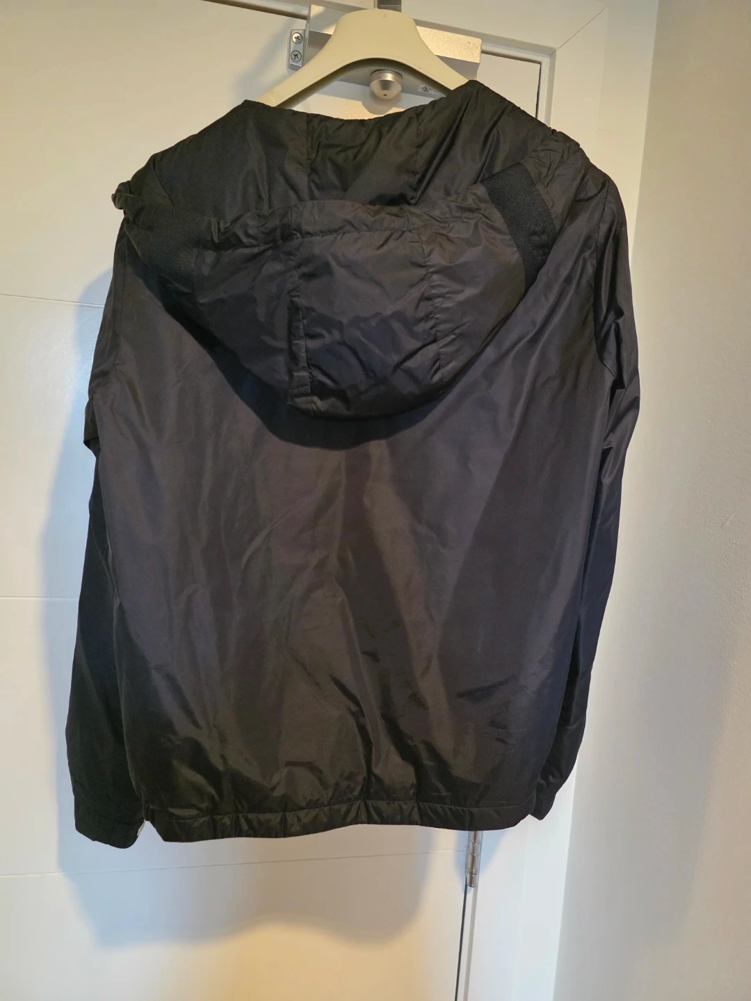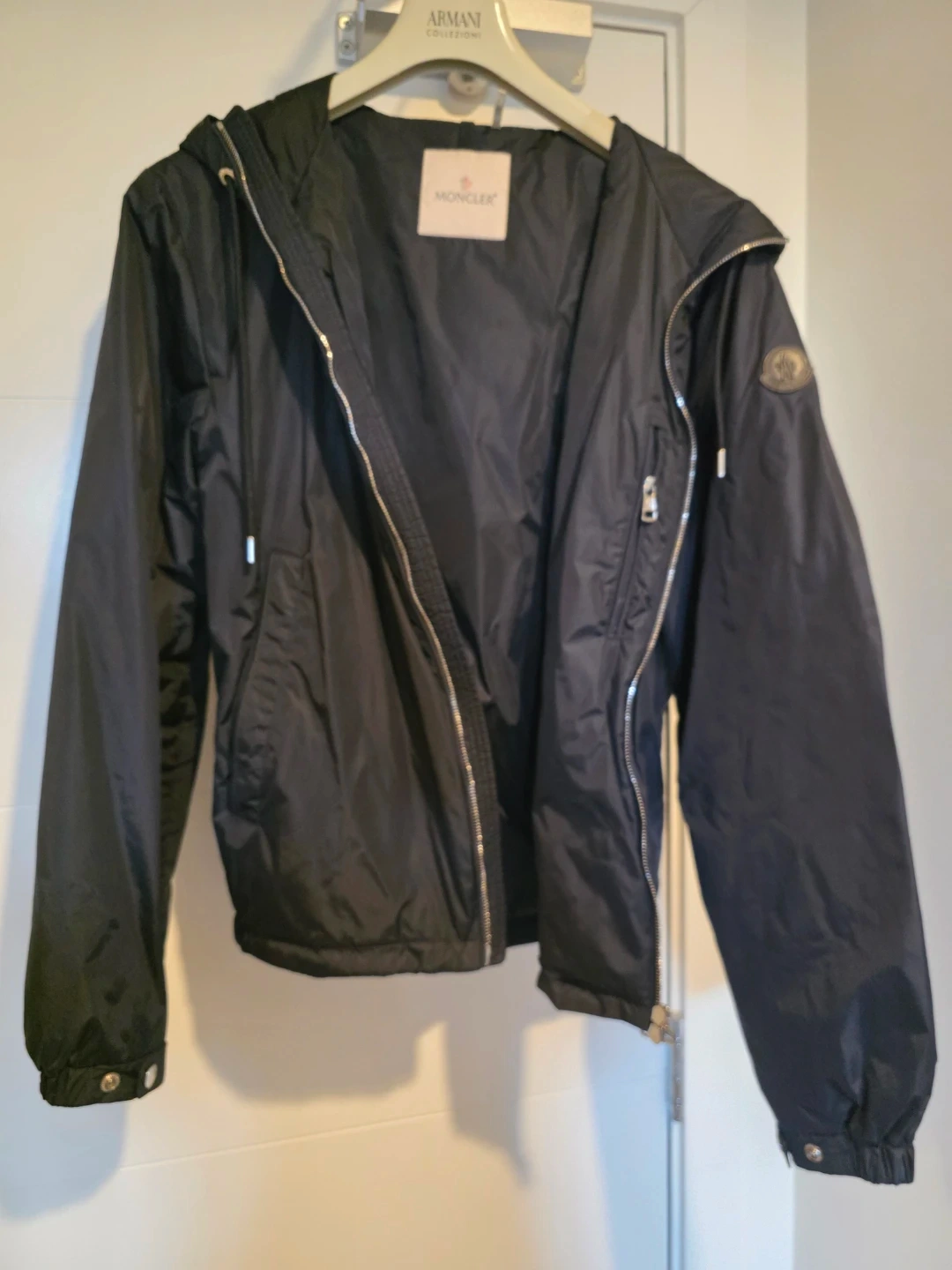 Moncler black lightweight hooded jacket. It's a stylish outerwear piece. Zipper front with snap closure cuffs. Perfect for transitional weather!