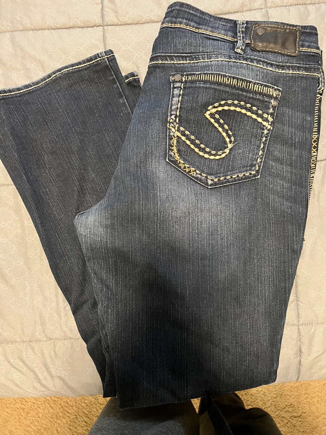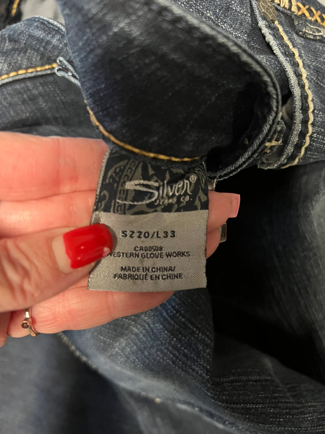 These are Silver Jeans Co. women's bootcut jeans. They're a dark wash denim with signature "S" stitching on the back pockets. Size is 20/33. Made in China. (Plus size)