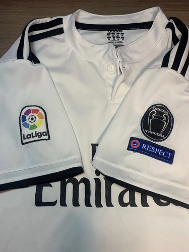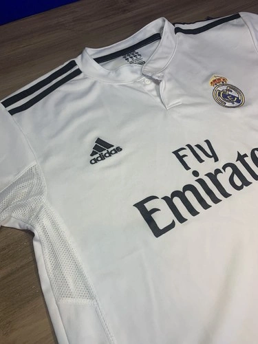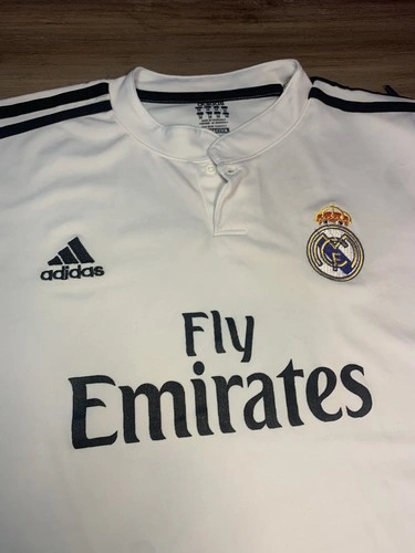 Showcase your allegiance to Real Madrid with this classic white Adidas 2019 Home Jersey. It features the iconic Adidas and Real Madrid logos. This is a men's size medium, offering a comfortable fit. Made from high-quality materials for durability and ease of care. Feel free to message if you have any questions!