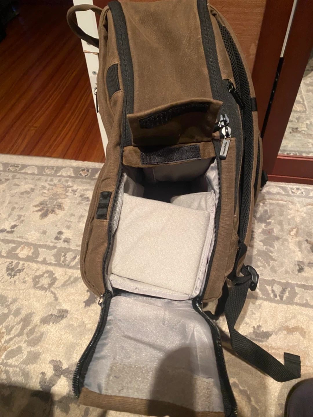 -Separate storage space for a camera and accessories with dedicated compartment for a 14" laptop or 12" tablet, with side mesh pocket for a water bottle and tripod loop