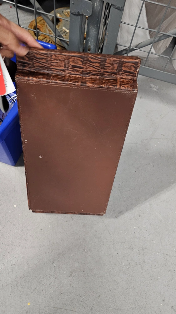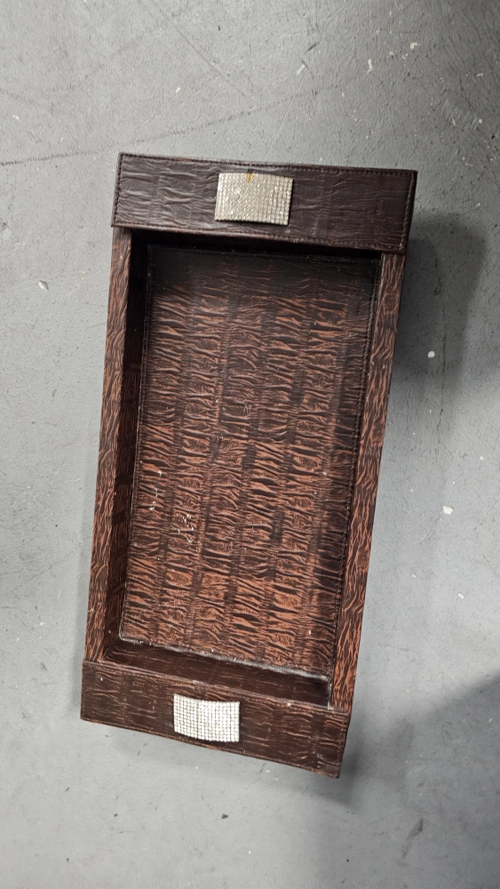 Selling a brown leatherette tray. It has a unique textured pattern and is accented with rhinestone details on both the sides. Perfect for adding a touch of glam to your home office or bathroom!
