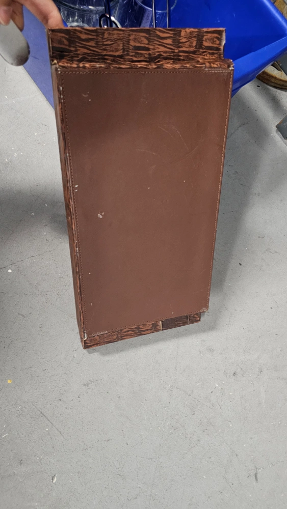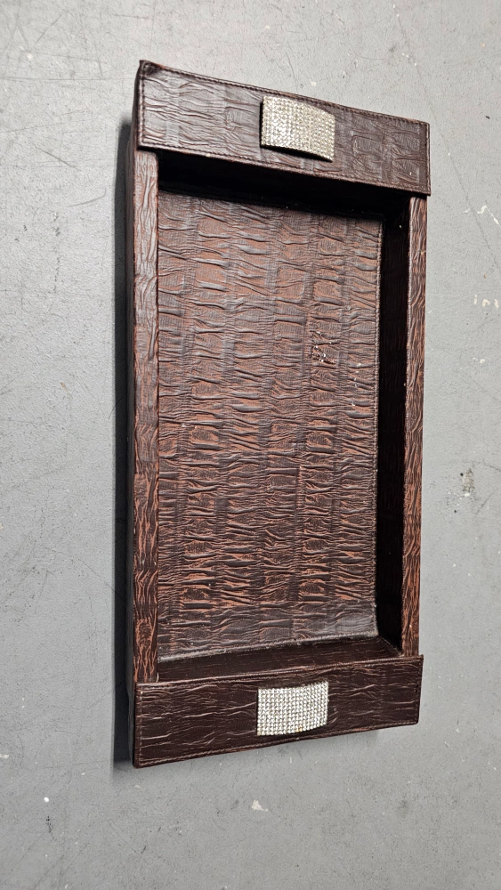 Selling a brown leatherette tray. It has a unique textured pattern and is accented with rhinestone details on both the sides. Perfect for adding a touch of glam to your home office or bathroom!
