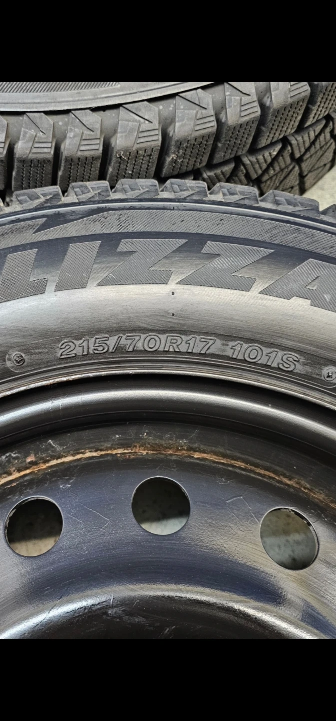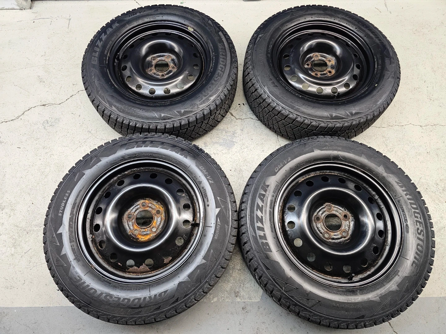 Set of 4 17" Bridgestone blizzak winter tires on steel rims used on Mazda cx-5 215/70 R17. Rims and tires are in good shape with lots of thread left on tires, no cracks, no damage