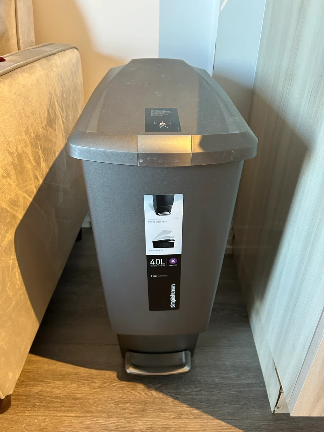 This new Simplehuman trash can has a 40L capacity and a strong steel pedal for hands-free operation. It also features a silent close lid, preventing loud slamming. The bin includes a pet-proof lock to keep curious animals out.