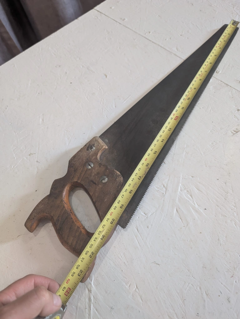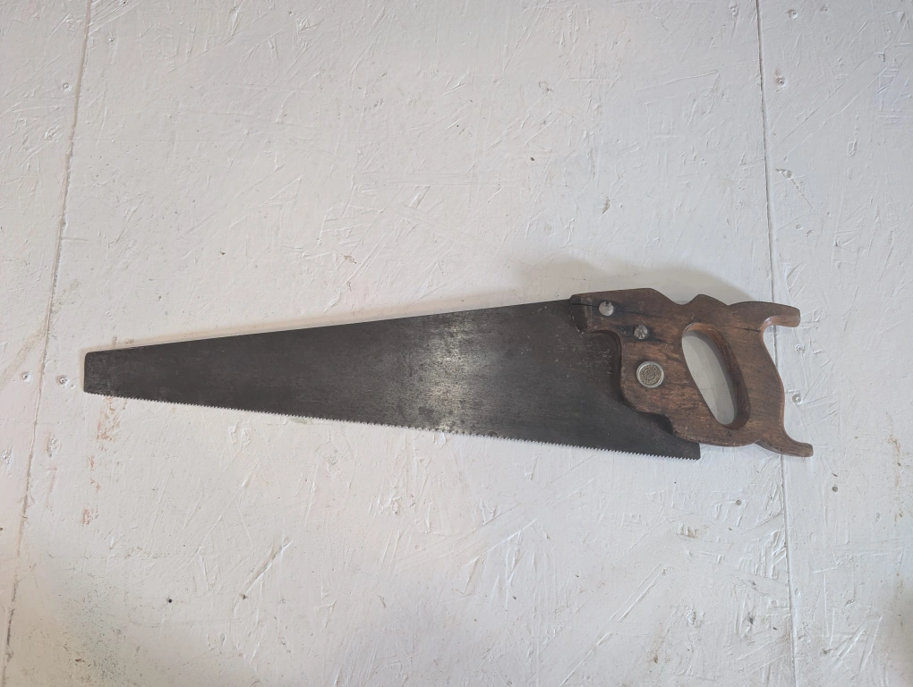 Selling a vintage hand saw. It's approximately 20 inches long blade. The handle is made of wood and has a unique design. It shows signs of wear and use, but it's still a functional tool!