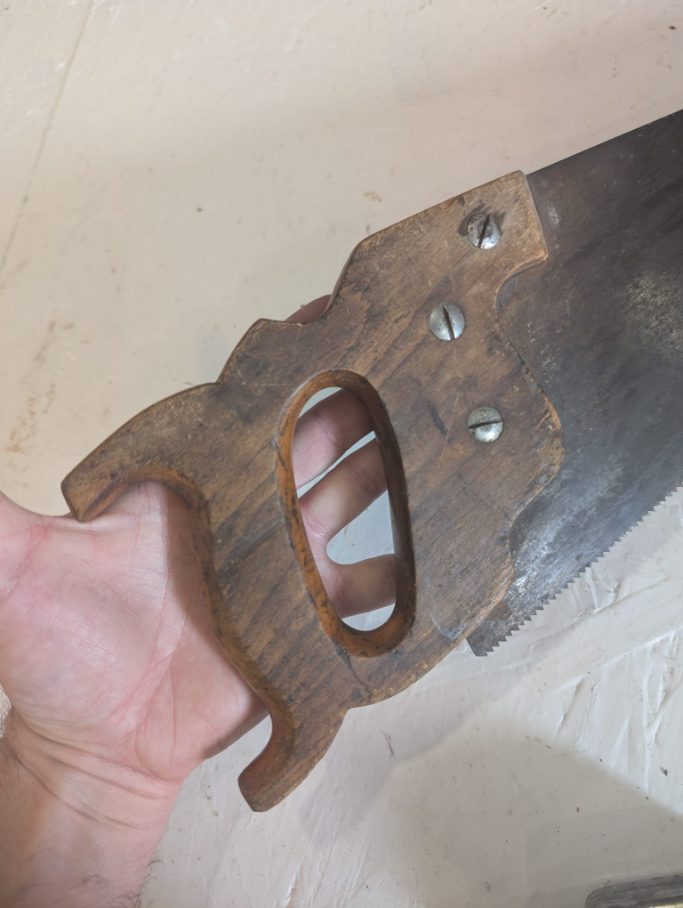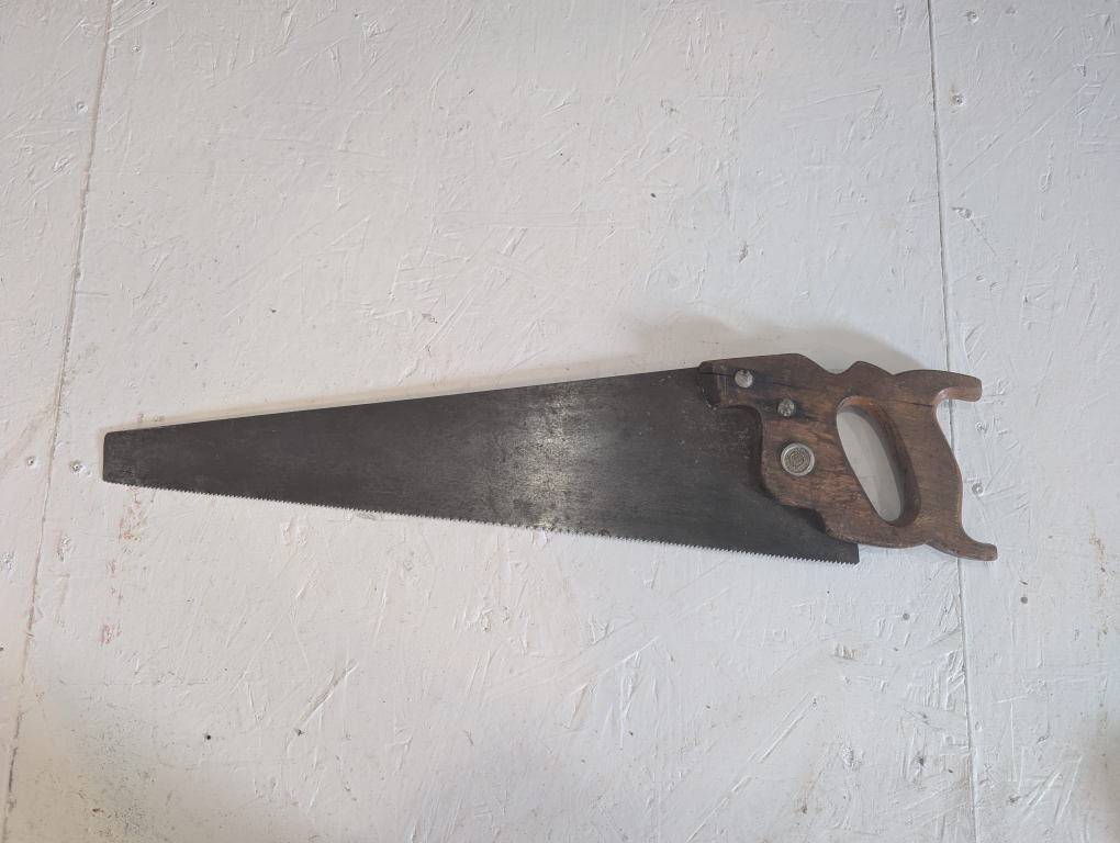 Selling a vintage hand saw. It's approximately 20 inches long blade. The handle is made of wood and has a unique design. It shows signs of wear and use, but it's still a functional tool!