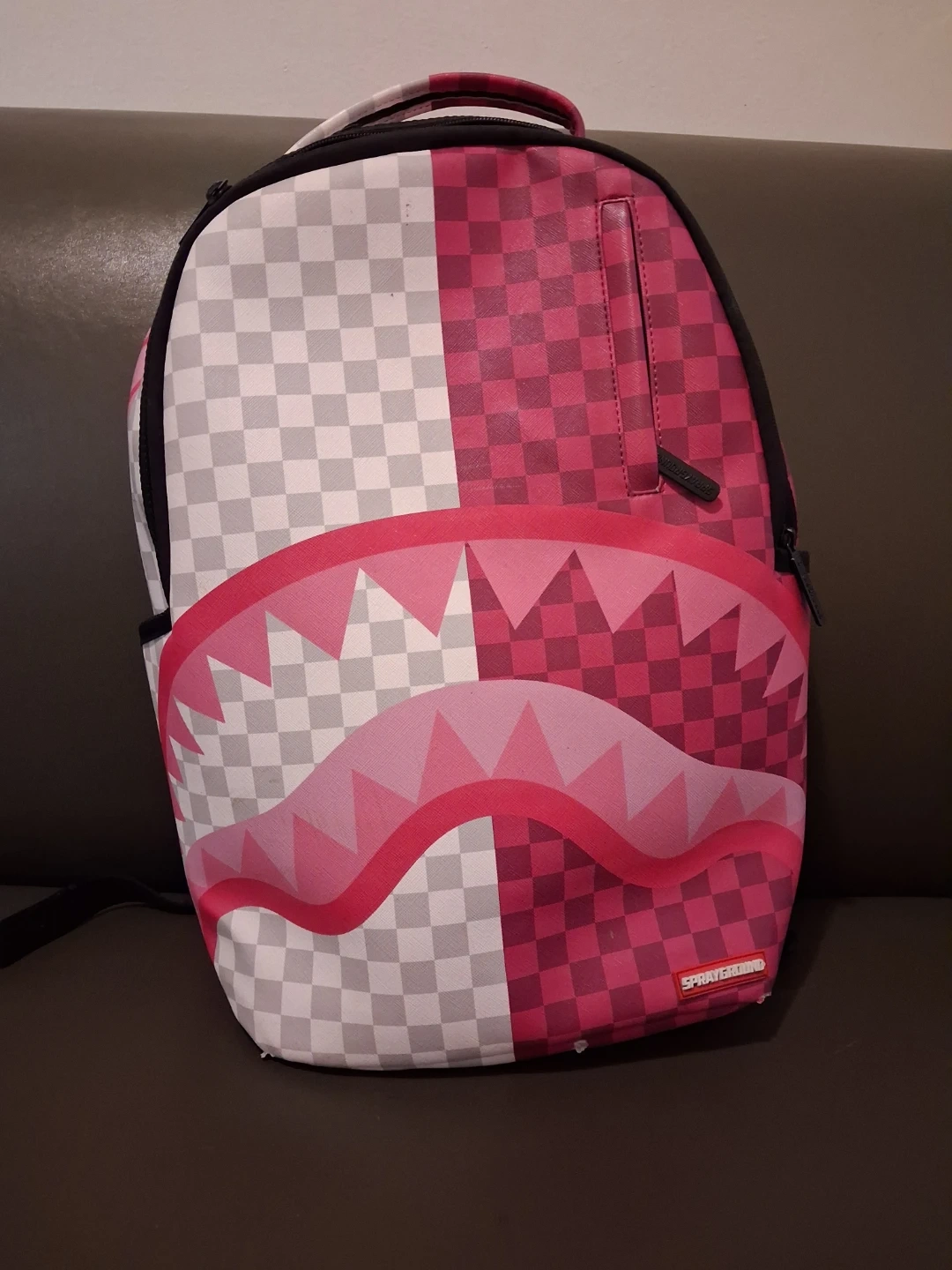 Selling a Sprayground backpack with a unique pink and white checkered design! It features the iconic shark mouth graphic. Great for school, travel, or everyday use