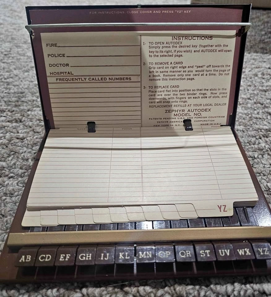 Retro Zephyr Autodex! This is a cool vintage desktop address book or phone number organizer. Has alphabetical keys so you can quickly find numbers. Comes with blank cards inside for all your contacts and some pre-printed emergency numbers too. Never been used!