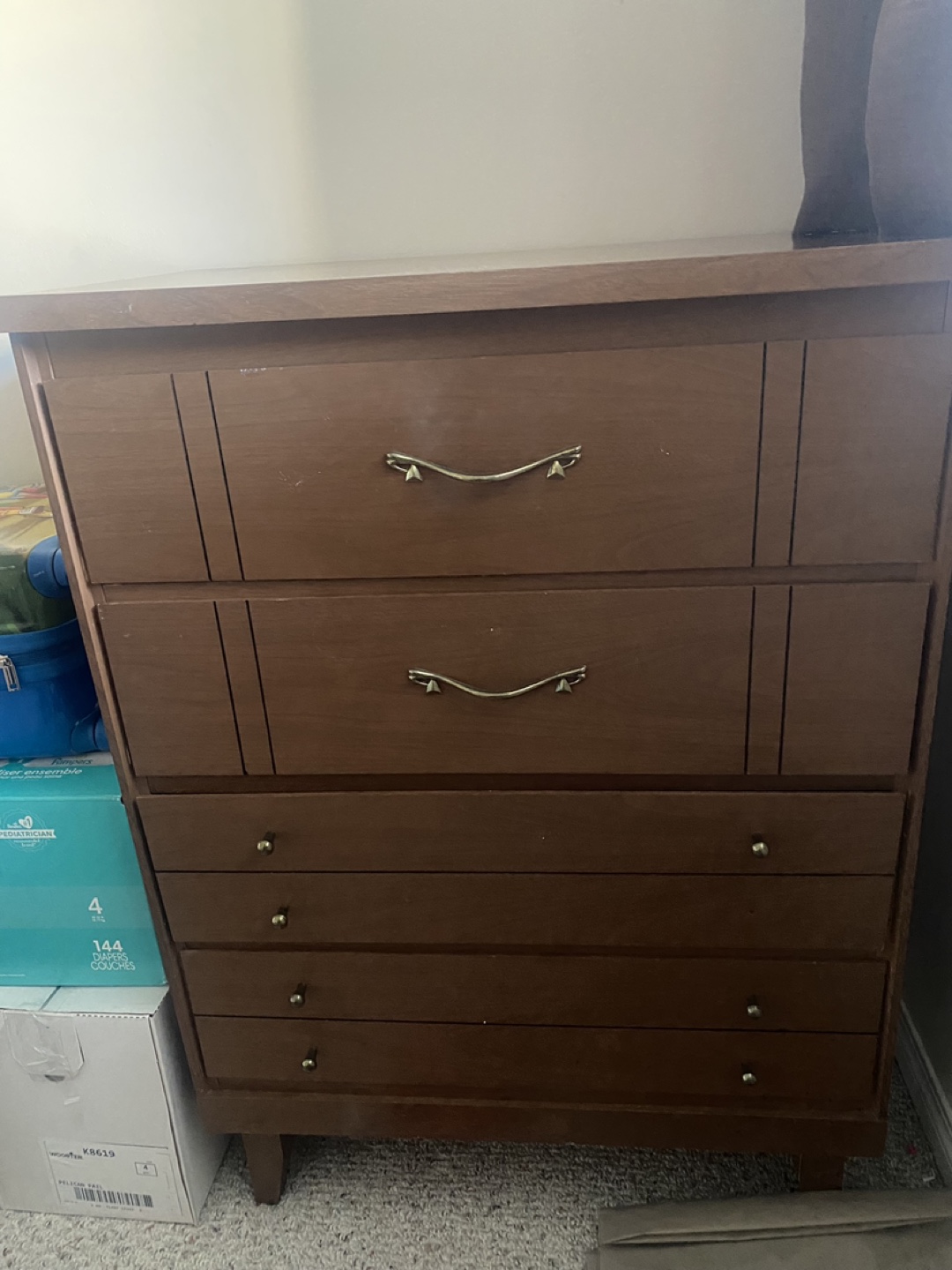1 / 11 / 1Buy & SellVintage Mid-Century Modern Chest of DrawersVintage Mid-Century Modern Chest of Drawers$36Five-drawer dresser. Brown wood. Gold tone hardware. Mid-century modern style. Some minor wear.WHERE TO MEETNwView MapSELLERverifiedAziNorthwest Calgary1000+115 reviews0 chats·0 favorites·43 viewsSEND CHAT TO SELLERHi Azi! I’m interested in your listing.Hi Azi! I’m interested in your listing.Get the Karrot app to chatSign In to chat