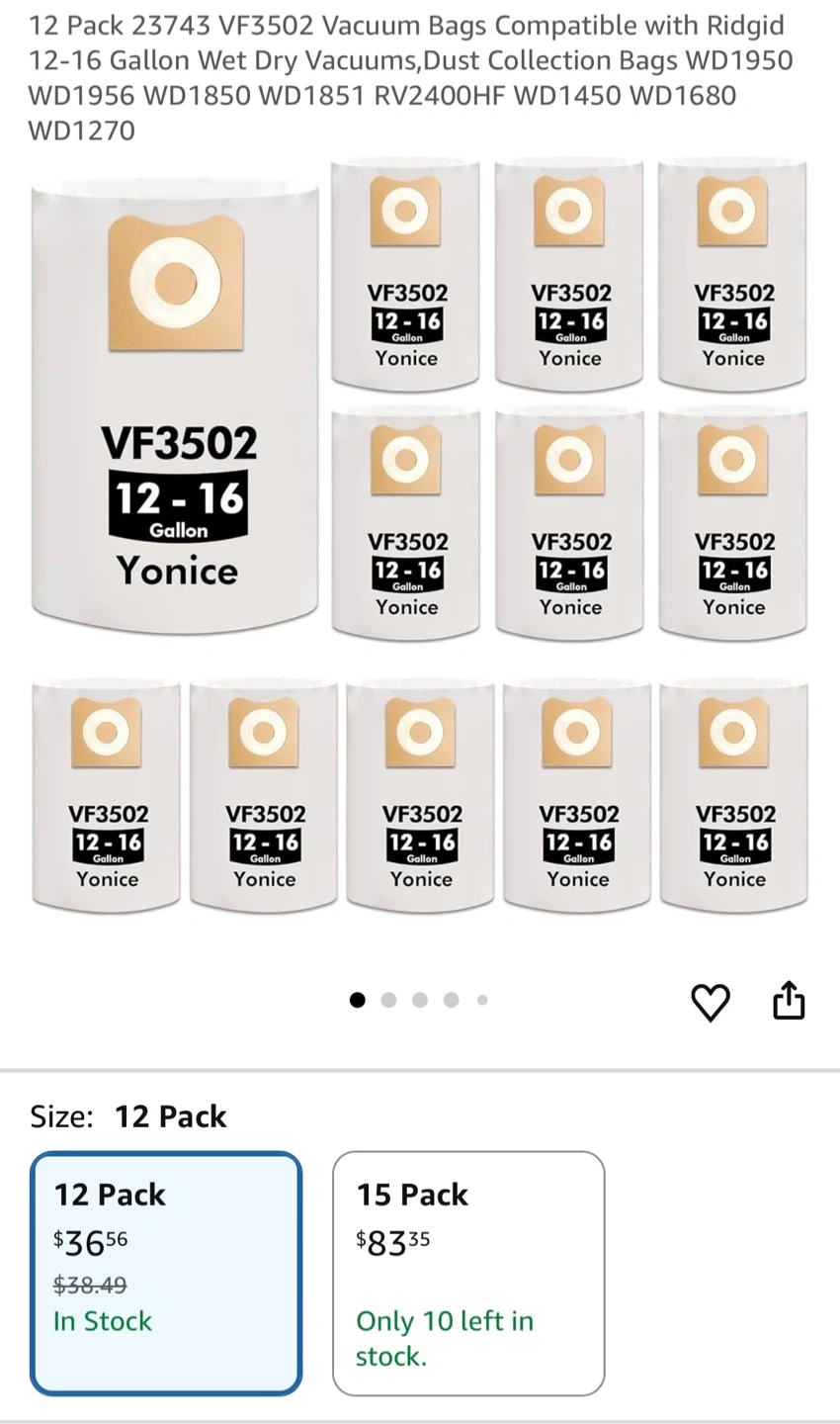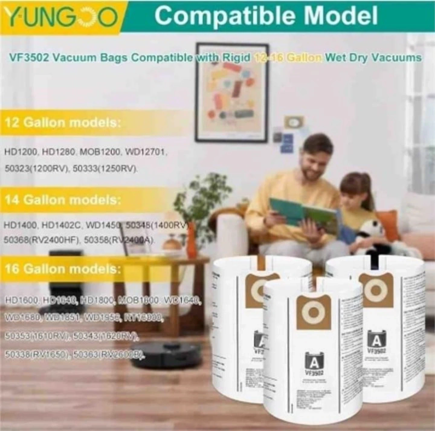 This is a 12 pack of VF3502 vacuum bags. They are compatible with Rigid 12-16 gallon wet dry vacuums. These bags are designed for dust collection.