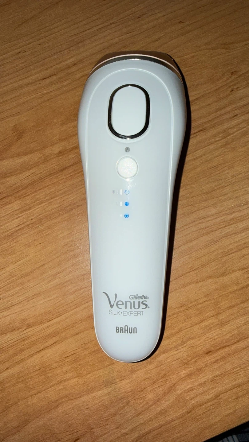 Selling a Gillette Venus Silk-Expert Intense Pulsed Light (IPL) hair removal system for the body and face, powered by Braun. It comes with the box and includes one hair removal device with charging cord.