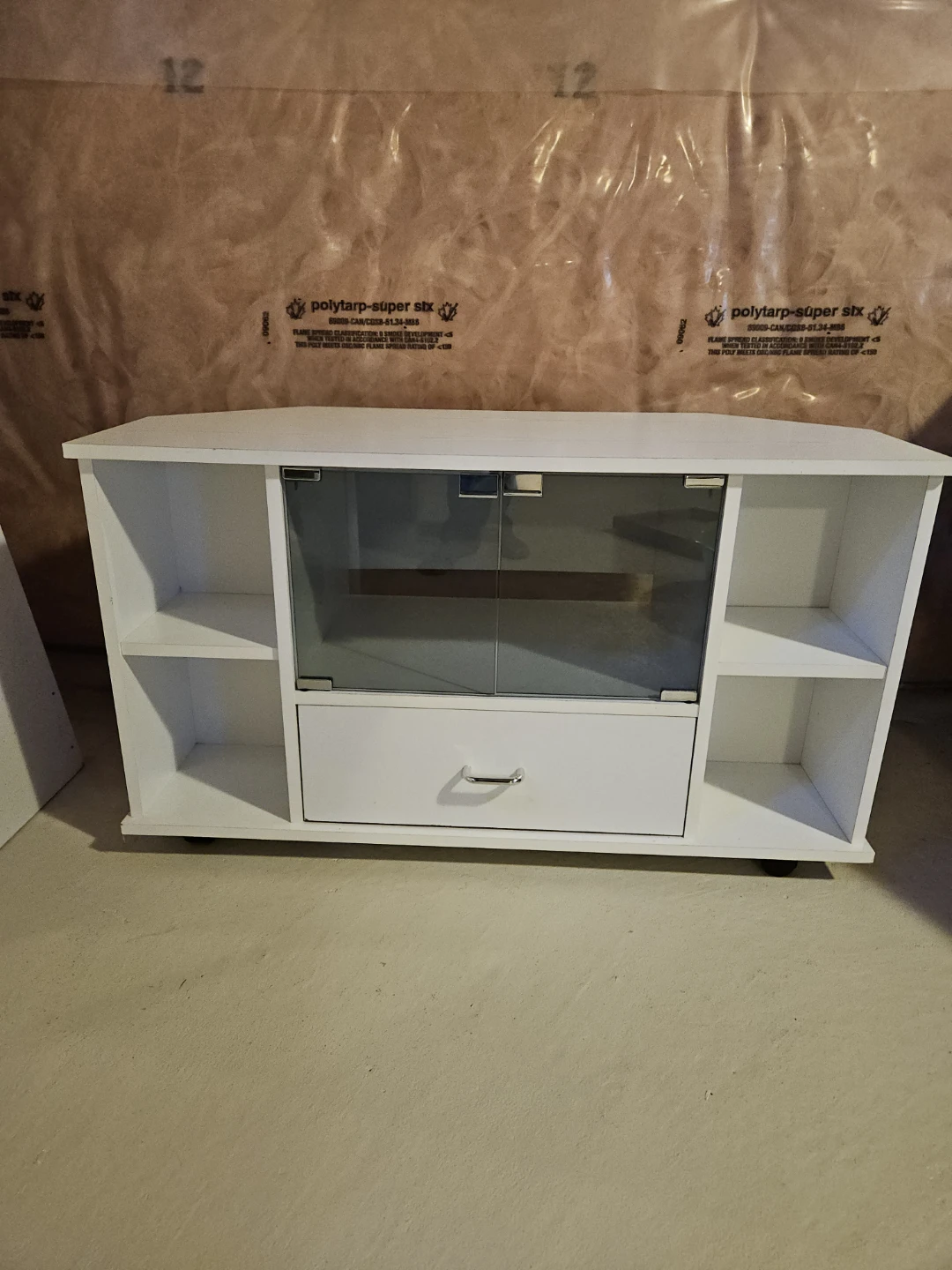 Used white corner TV stand with glass doors (on wheels). Could be used along a straight wall as well. In very good used condition. Approx 35 1/2" W x 15 1/4" D x 20 1/4" H.