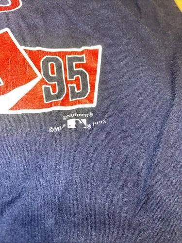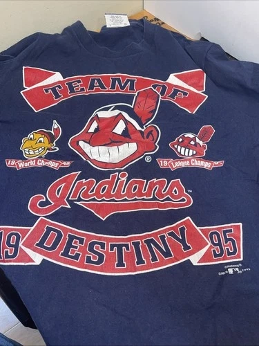 The Cleveland Indians 95 Destiny T-shirt in size Large by Lee Sports is a vintage men's short sleeve t-shirt featuring the iconic Cleveland Indians character in a blue color. Manufactured between 1990-1999, this t-shirt showcases the team's theme and is a must-have for any fan of the sport. Made by a reputable brand like Lee Sports, this shirt is a collectible piece that captures a moment in baseball history. See all pictures of item Sold as is Check out my store for more 100% feedback given Thank you for shopping The store 123 abc Please check out my store.