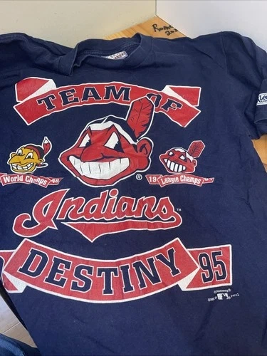 The Cleveland Indians 95 Destiny T-shirt in size Large by Lee Sports is a vintage men's short sleeve t-shirt featuring the iconic Cleveland Indians character in a blue color. Manufactured between 1990-1999, this t-shirt showcases the team's theme and is a must-have for any fan of the sport. Made by a reputable brand like Lee Sports, this shirt is a collectible piece that captures a moment in baseball history. See all pictures of item Sold as is Check out my store for more 100% feedback given Thank you for shopping The store 123 abc Please check out my store.
