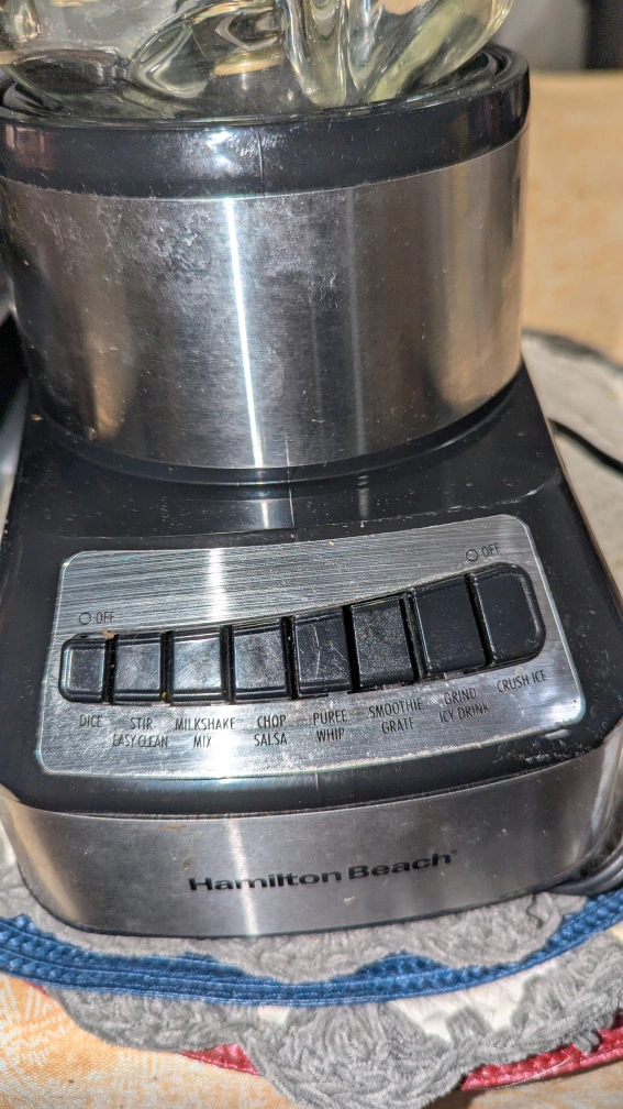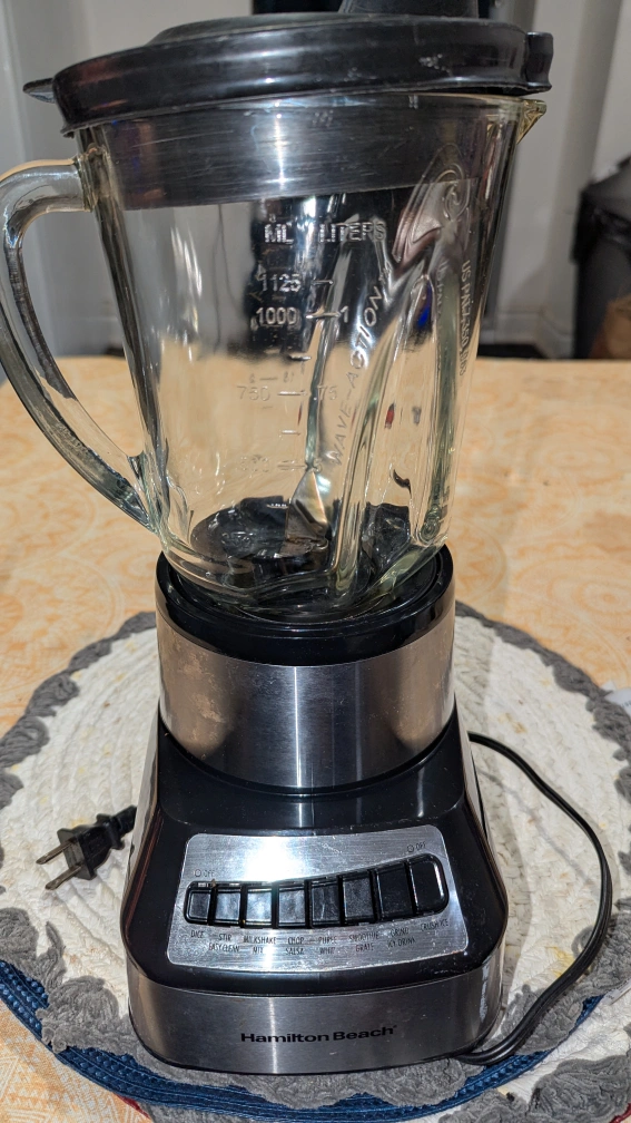 Used Hamilton Beach blender. Glass jar. Multiple settings: dice, stir, milkshake, chop, puree, whip, smoothie, grate, crush ice, icy drink. Includes lid. cash only. pickup only.