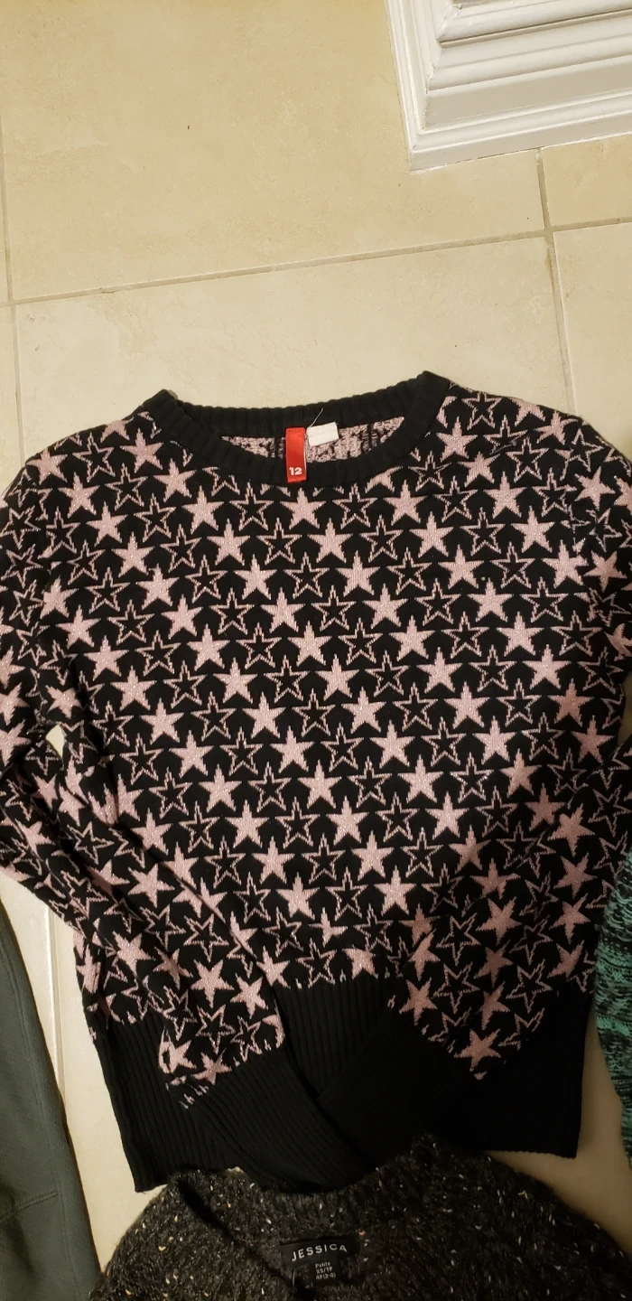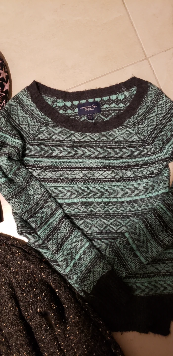 Selling a bundle of sweaters, jogger! Includes a grey Jessica sweater, a black and pink star sweater from H&M (size 12), and a turquoise and black patterned sweater from American Eagle (size M). All in good condition and ready for a new home! 15 per piece