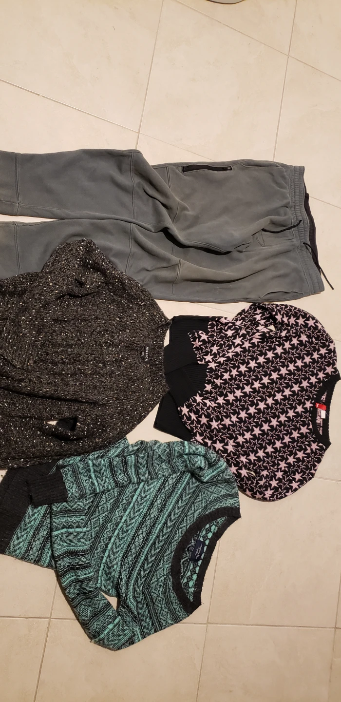 Selling a bundle of sweaters, jogger! Includes a grey Jessica sweater, a black and pink star sweater from H&M (size 12), and a turquoise and black patterned sweater from American Eagle (size M). All in good condition and ready for a new home! 15 per piece