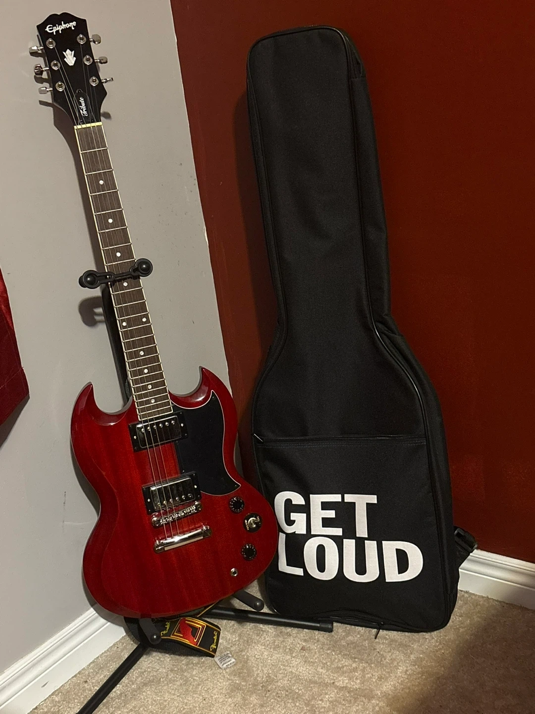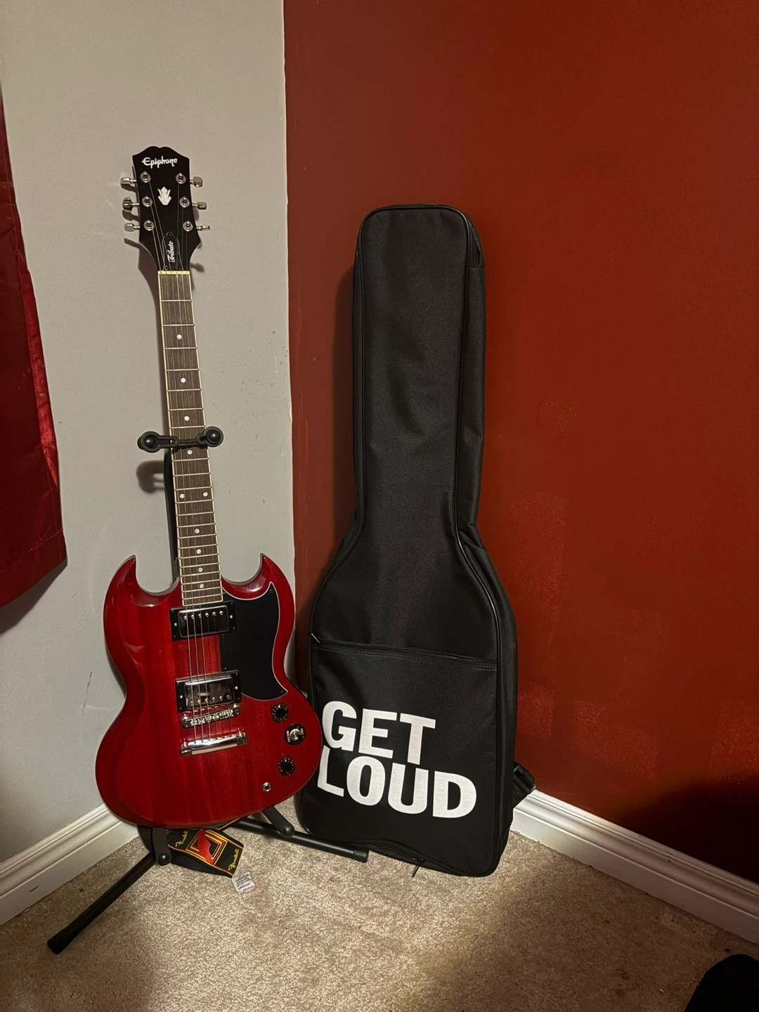 Red Epiphone SG electric guitar. It's in great condition and comes with a black bag that says "GET LOUD", Spark Go Bluetooth Amp, Guitar stand. Perfect for beginners or seasoned players looking for a classic look and sound.
