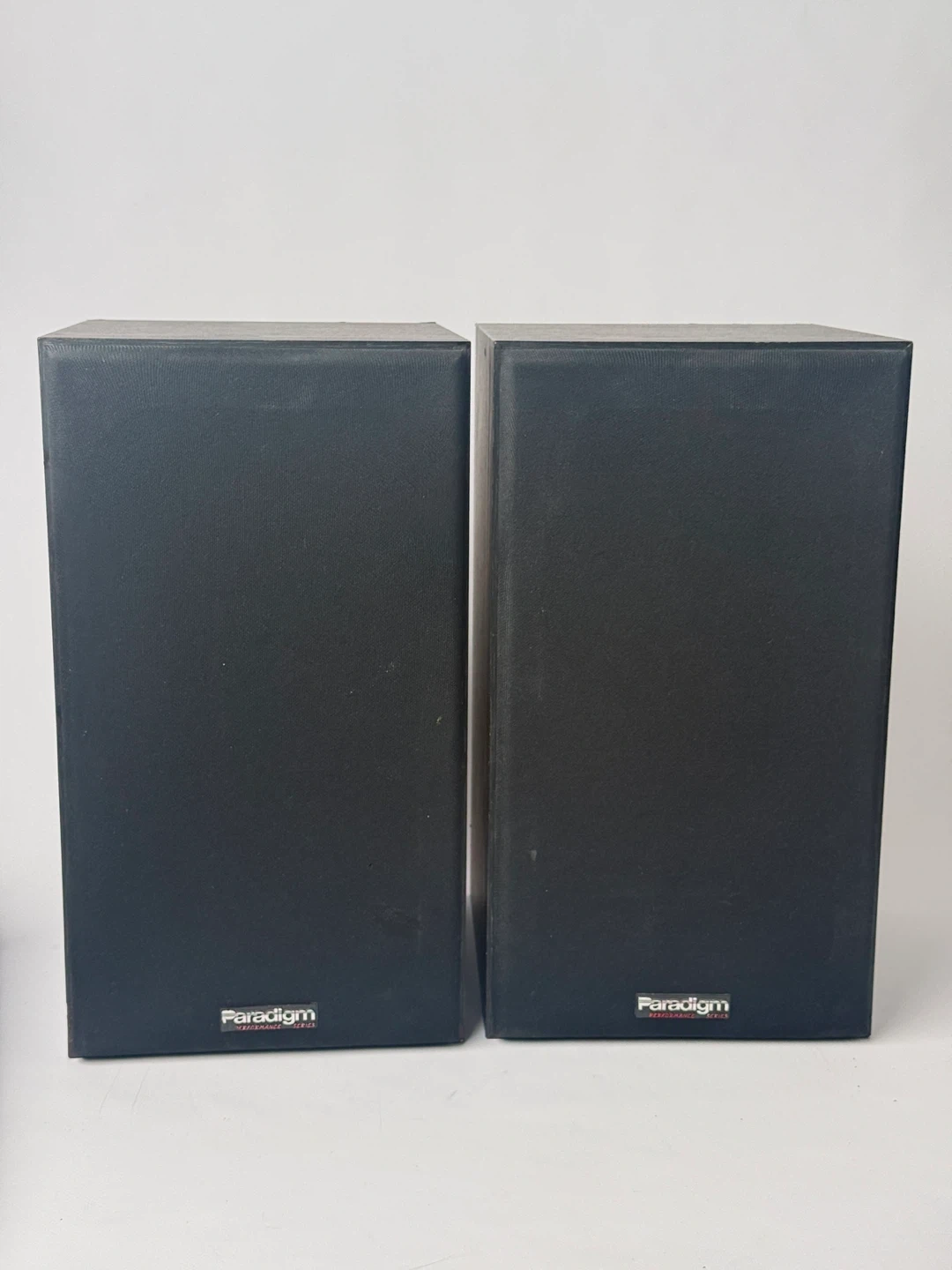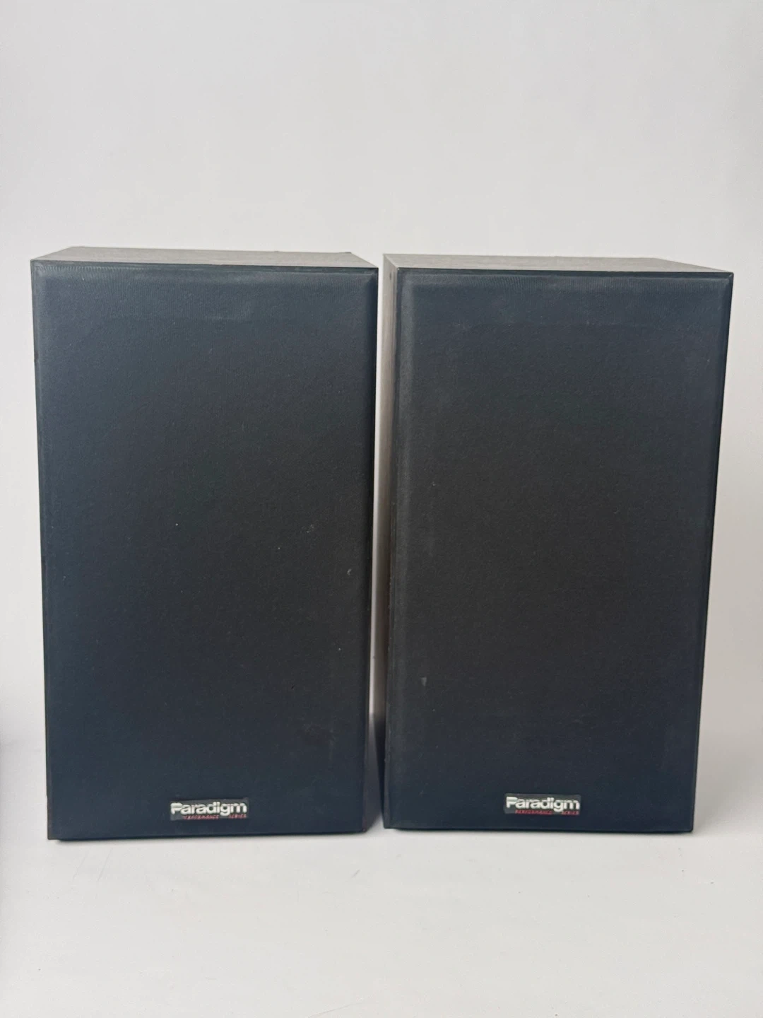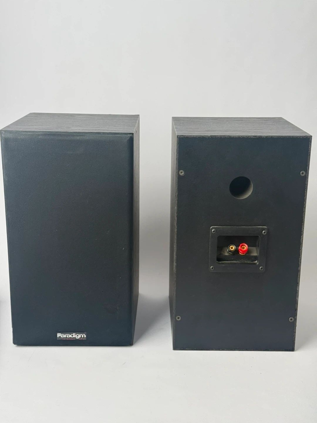 A pair of Paradigm bookshelf speakers in black. These compact speakers are great for stereo listening or as part of a home theatre setup. They feature binding post terminals for easy connection.