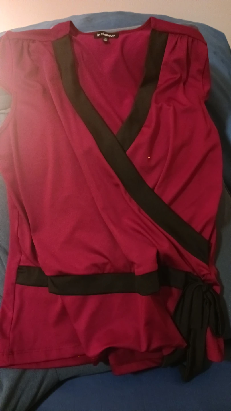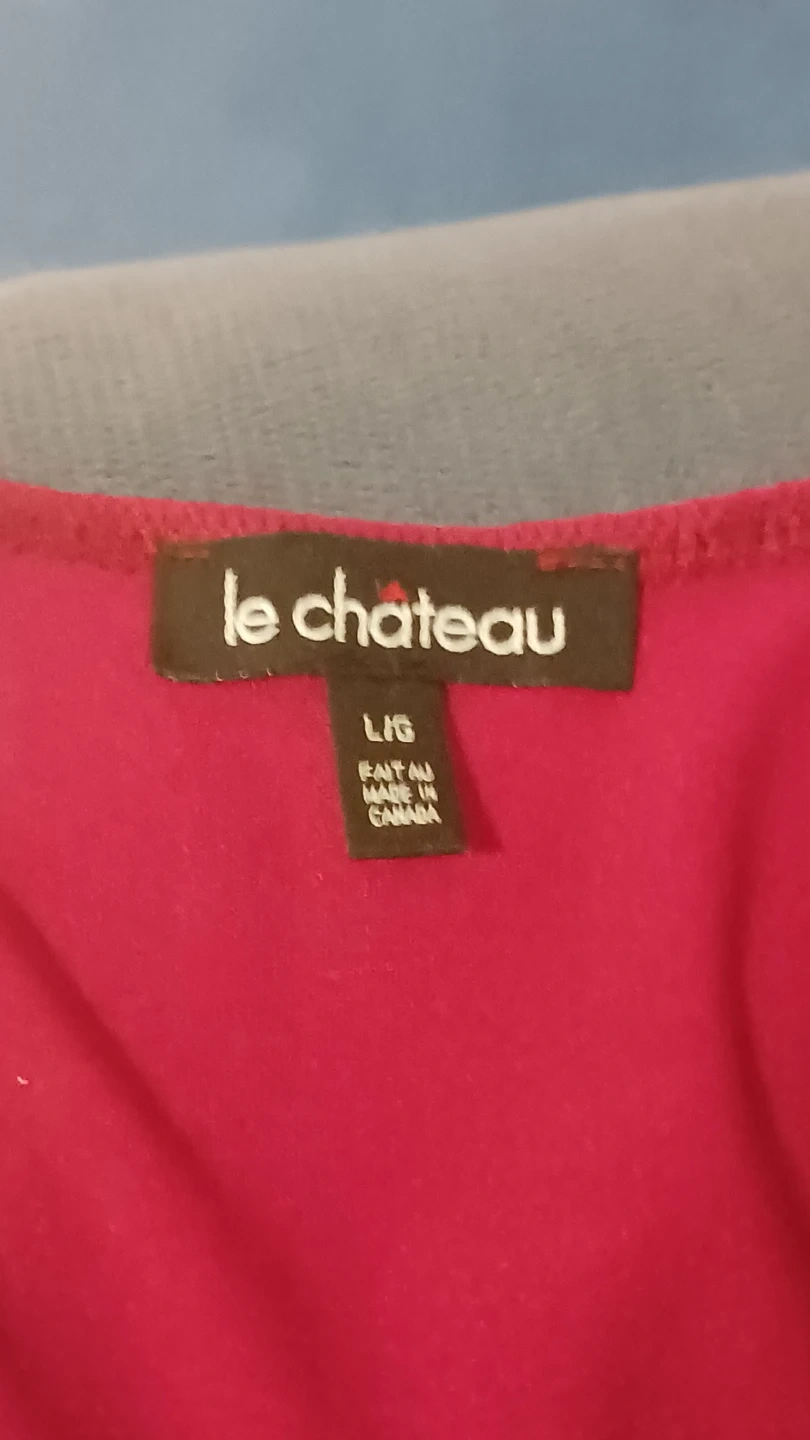 This Le Château top comes in a vibrant magenta colour with a stylish black trim. It's a women's size large with a flattering V-neck and a wrap-style front. Made in Canada. It's perfect for adding a pop of colour to your wardrobe!