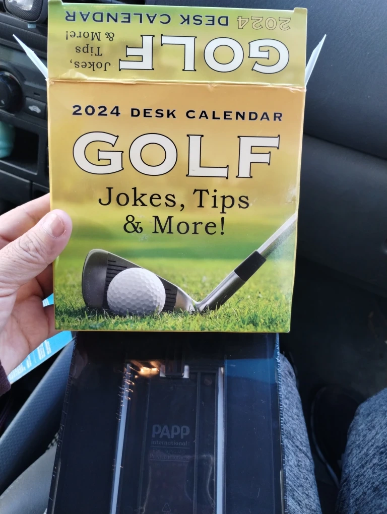 Brand new 2024 desk calendar featuring golf jokes, tips, and more! It comes in its original packaging and includes a stand .
