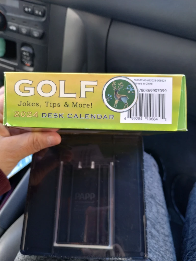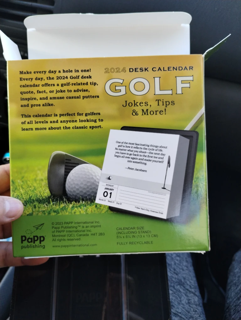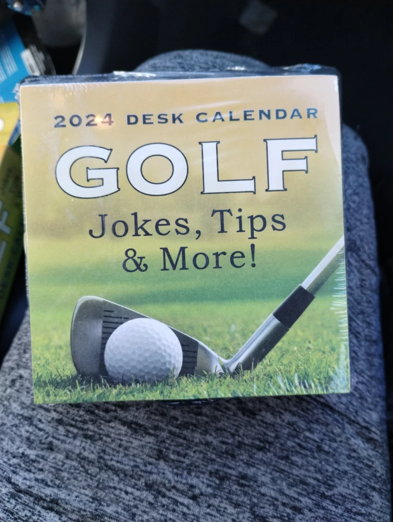 Brand new 2024 desk calendar featuring golf jokes, tips, and more! It comes in its original packaging and includes a stand .