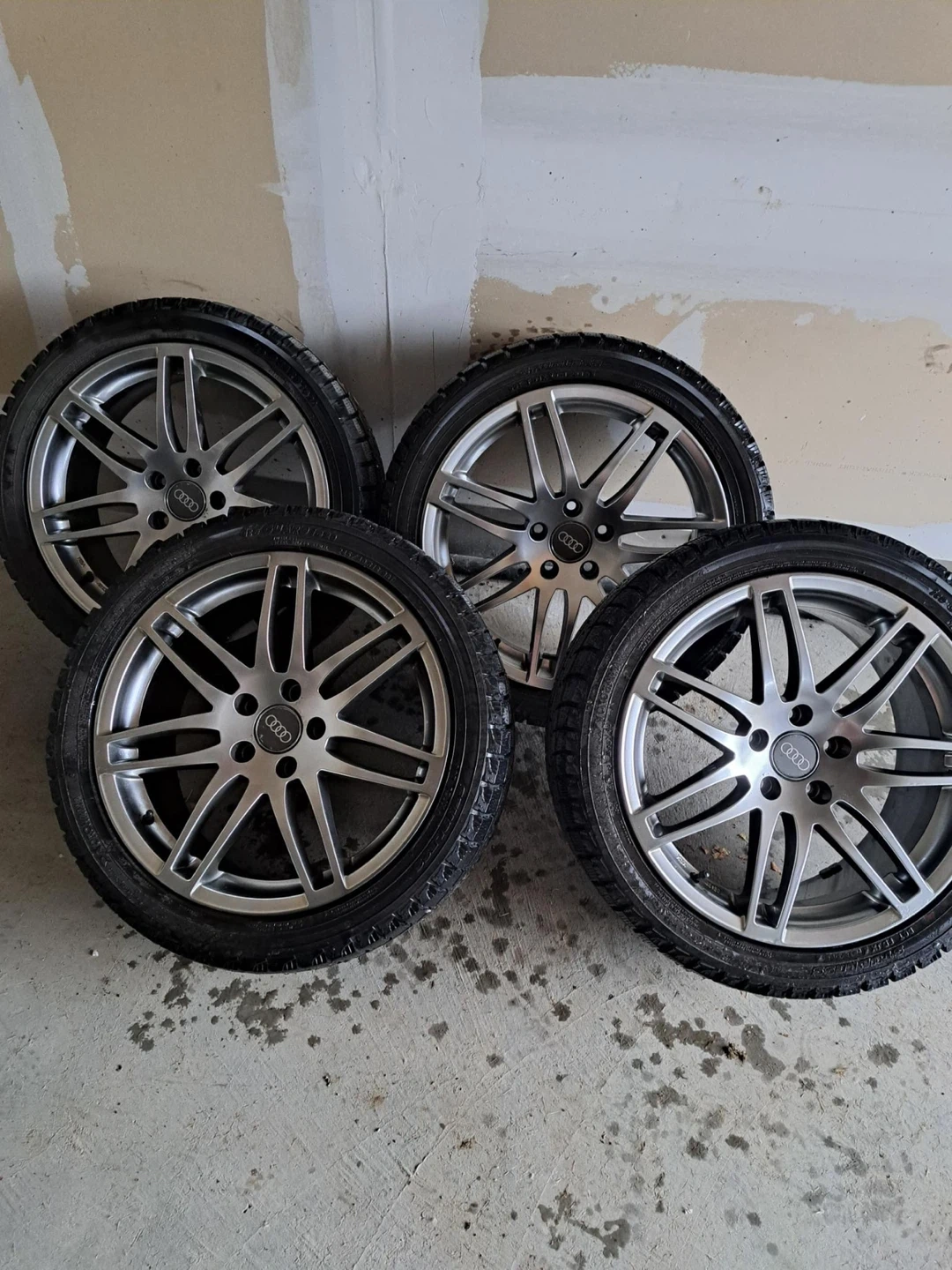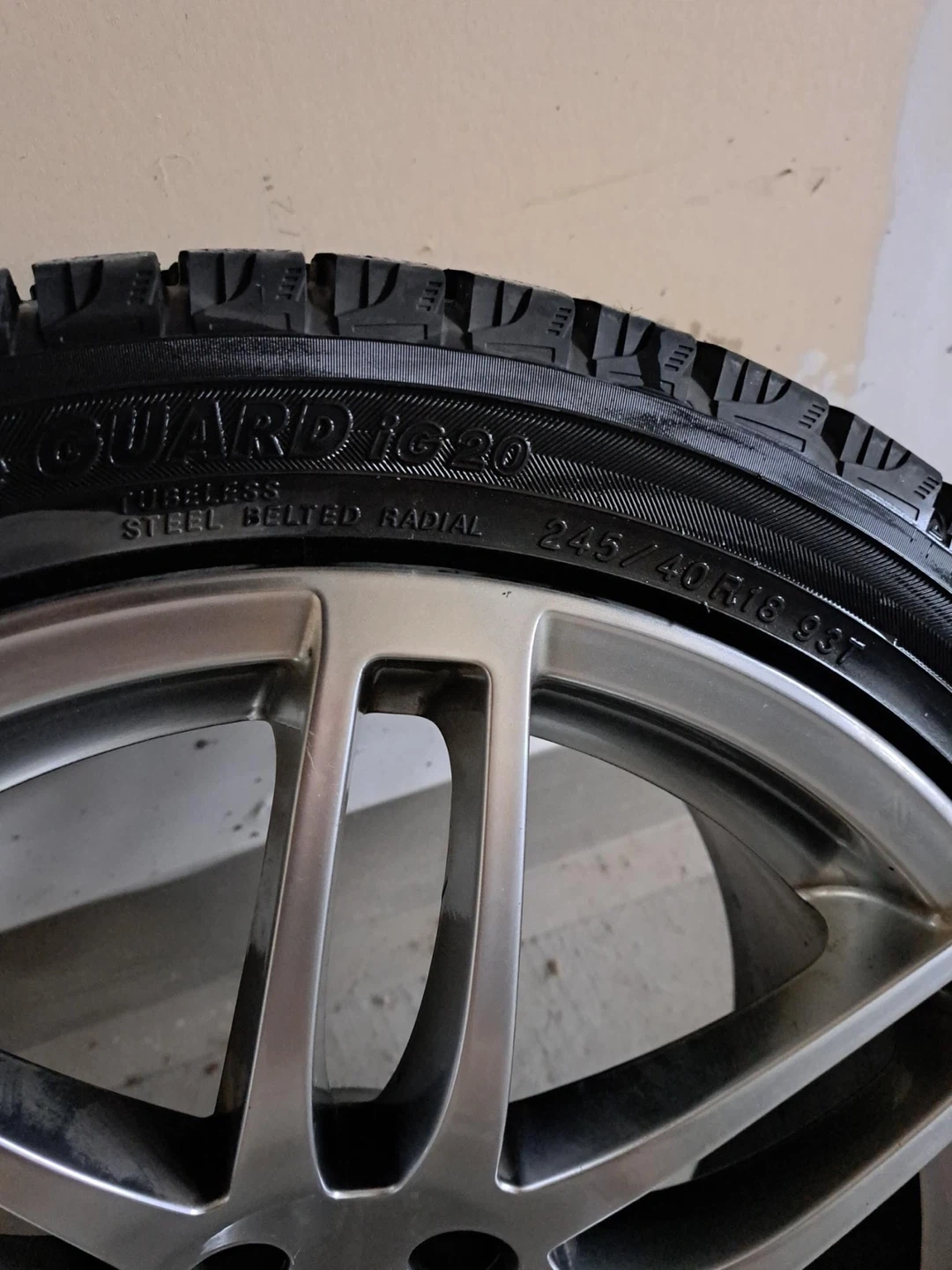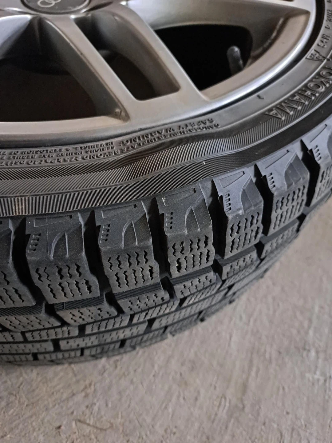 Set of 4-18" Audi mags with Yokohama ice Guard iG20 snow tires 245/40R18 93T. One tire has small bulge as per pic. Used on 2018 A5 S line, but compatible with several Audi cars and model years. Buyer to verify compatibility.