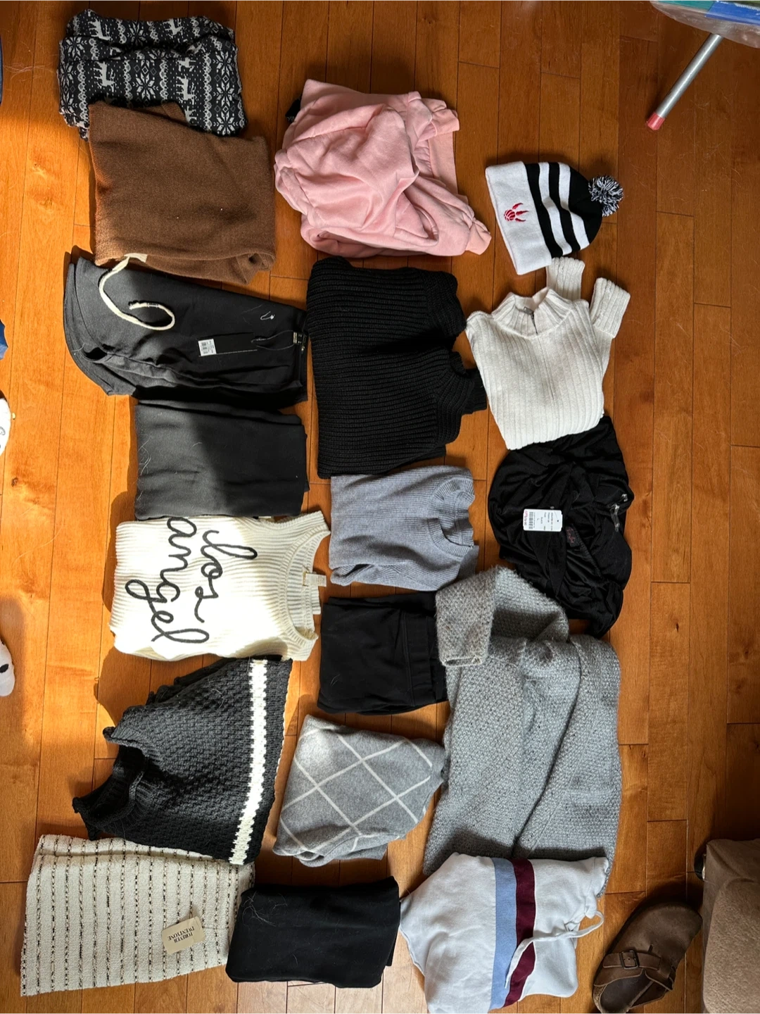 Selling a collection of assorted clothing items! There's a variety of sweaters, tops, and pants in different colours and styles. Perfect for building a new wardrobe or adding to your current one
